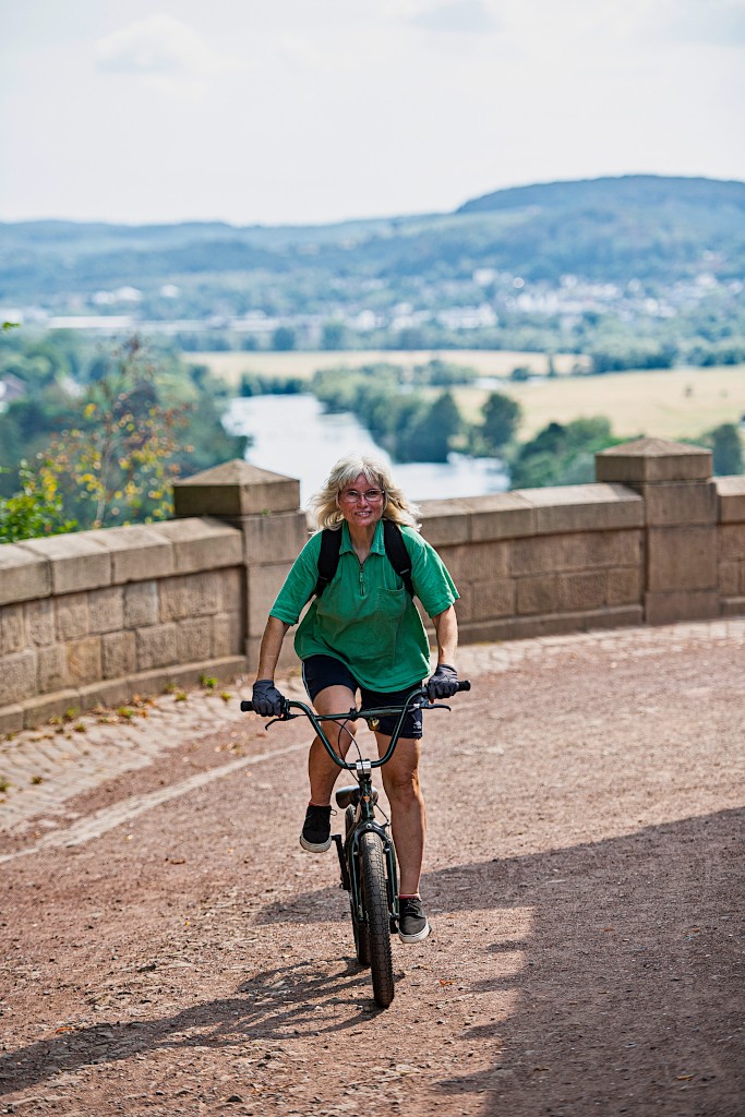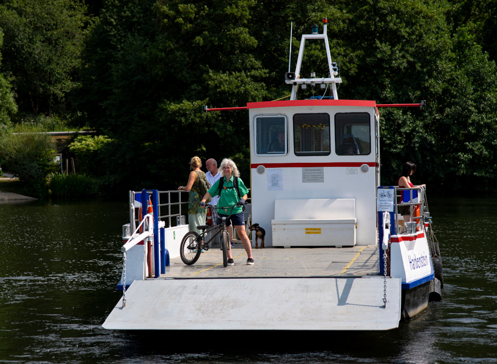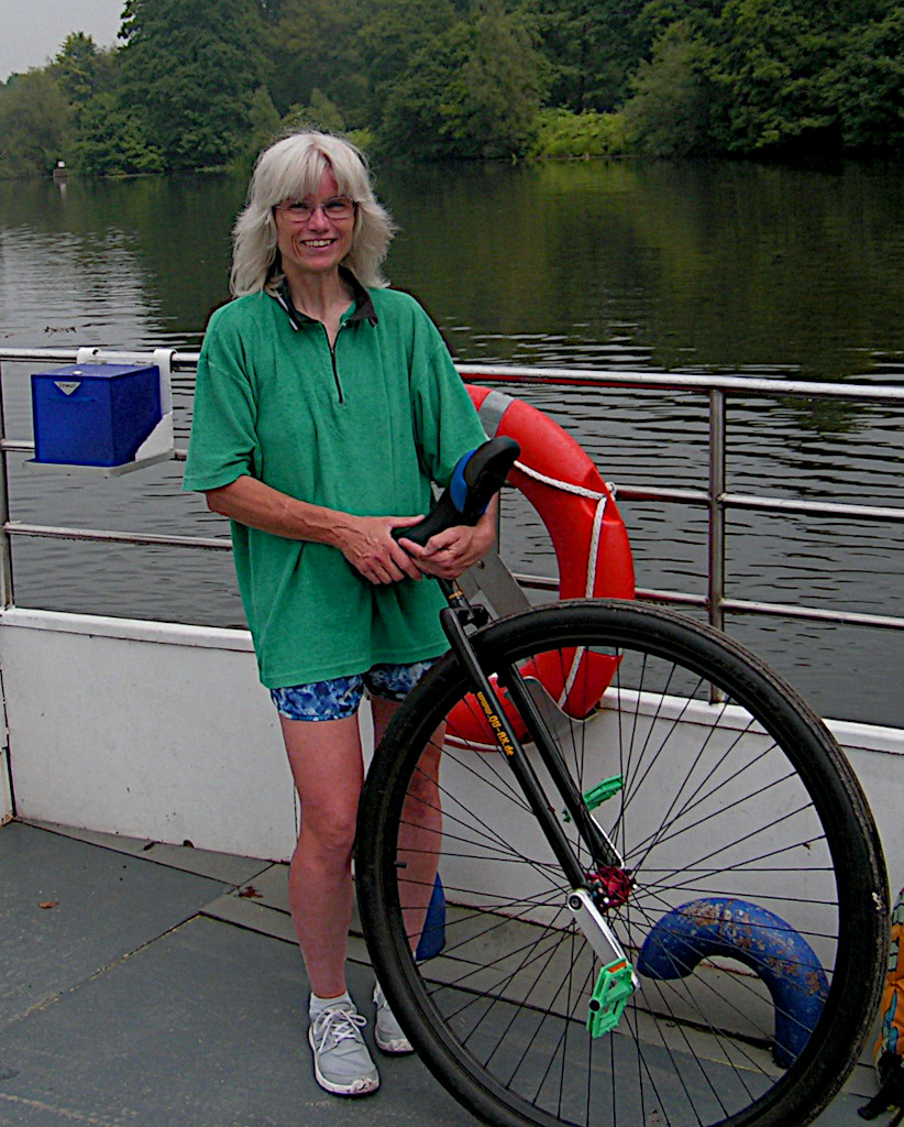 Auf dem Bild oben siehst du mich mit dem „Hauptgewinn“ und Anhänger und links bin ich mit dem 36er Einrad auf der Ruhrtalfähre Hardenstein unterwegs.