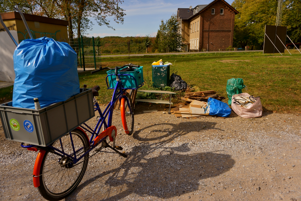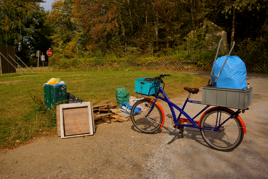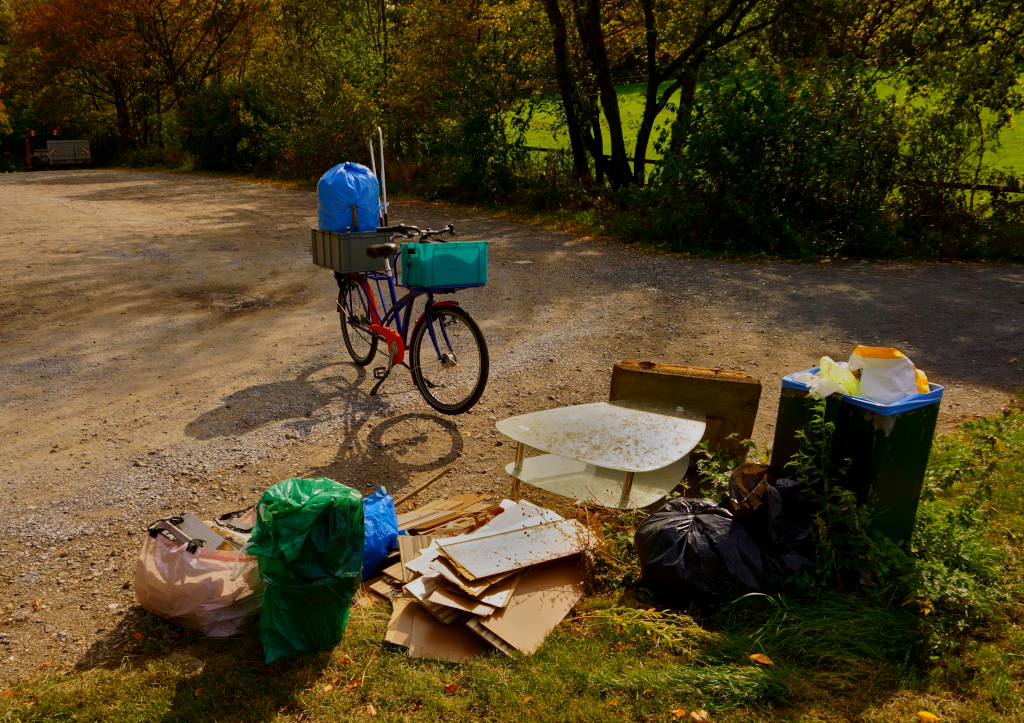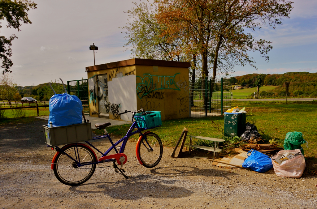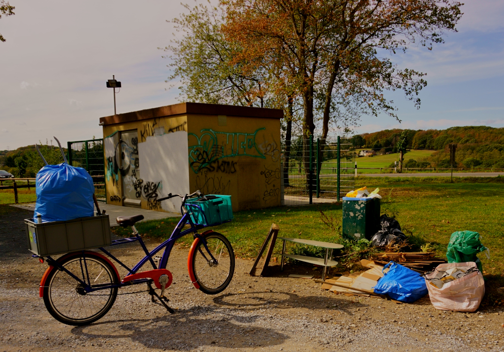 Den Sperrmüll, der in den umliegenden Büschen des Parkplatzes verteilt war, legte ich zentral neben einem Mülleimer zur Entsorgung durch die Stadtreinigung hin.