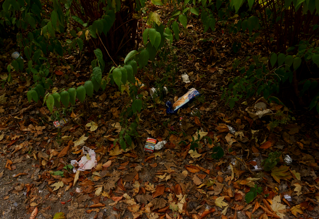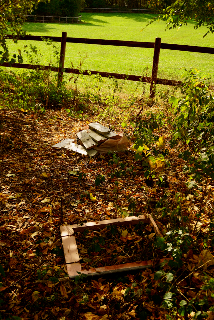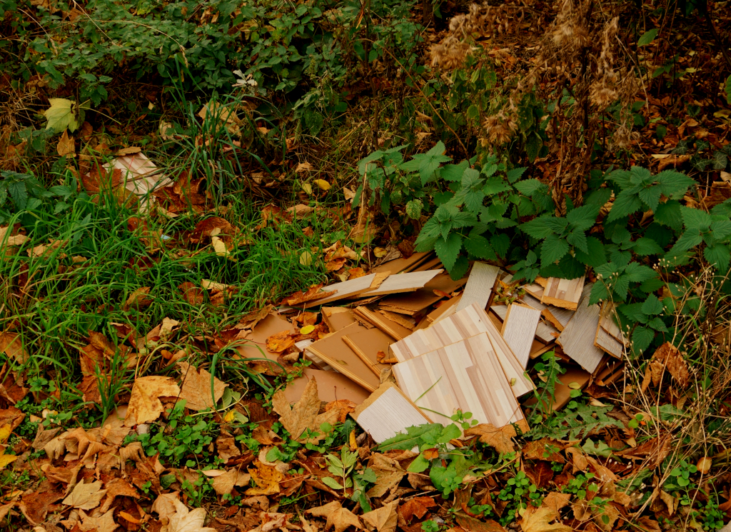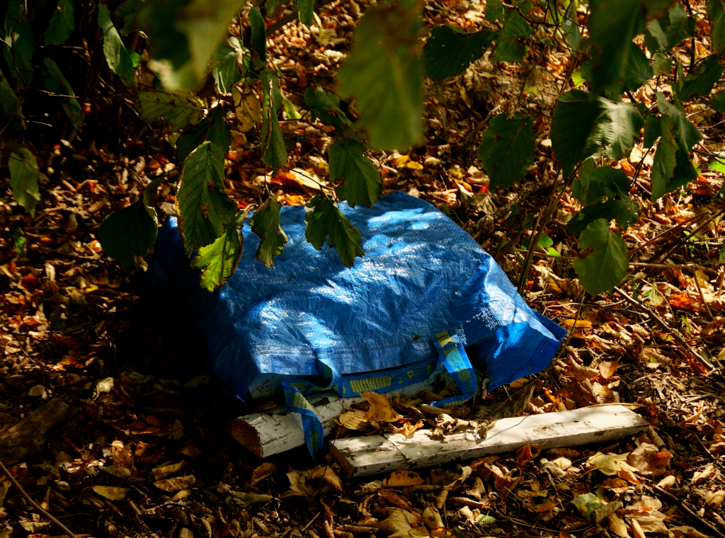 Den Sperrmüll, der in den umliegenden Büschen des Parkplatzes verteilt war, legte ich zentral neben einem Mülleimer zur Entsorgung durch die Stadtreinigung hin.