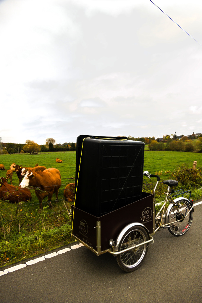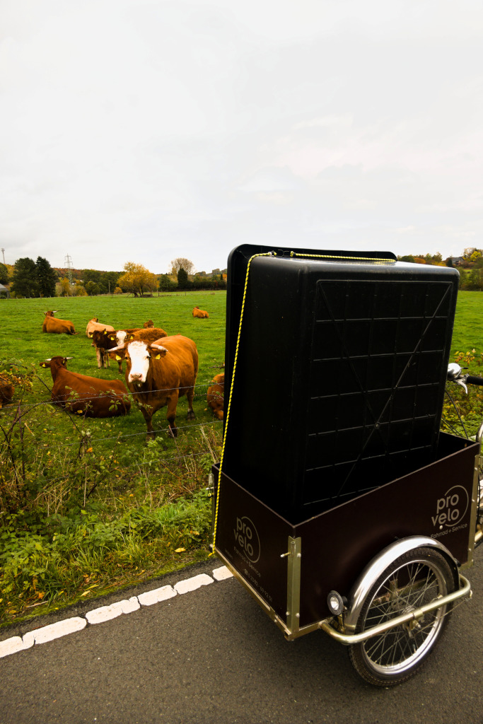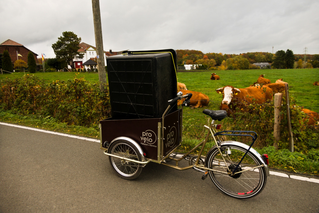 Ich hatte das Becken schon fix und fertig auf dem großen Fahrradanhänger befestigt und den Hauptgewinn als Zugmaschine davor gespannt.