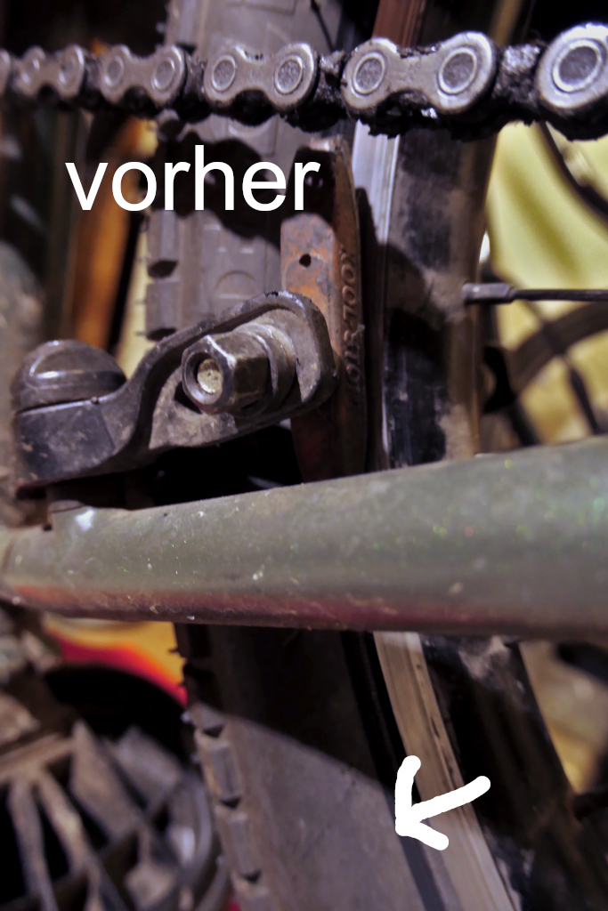 Auf den Bildern könnt ihr sehen, dass das Hinterrad inzwischen am hinteren Ende des Ausfallendes verschraubt war. Des Weiteren schliffen schon die Bremskötze an der Innenseite der Reifen- nicht gut!