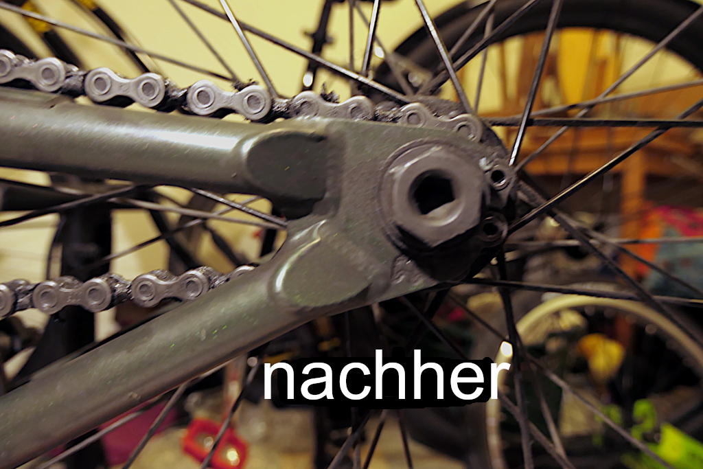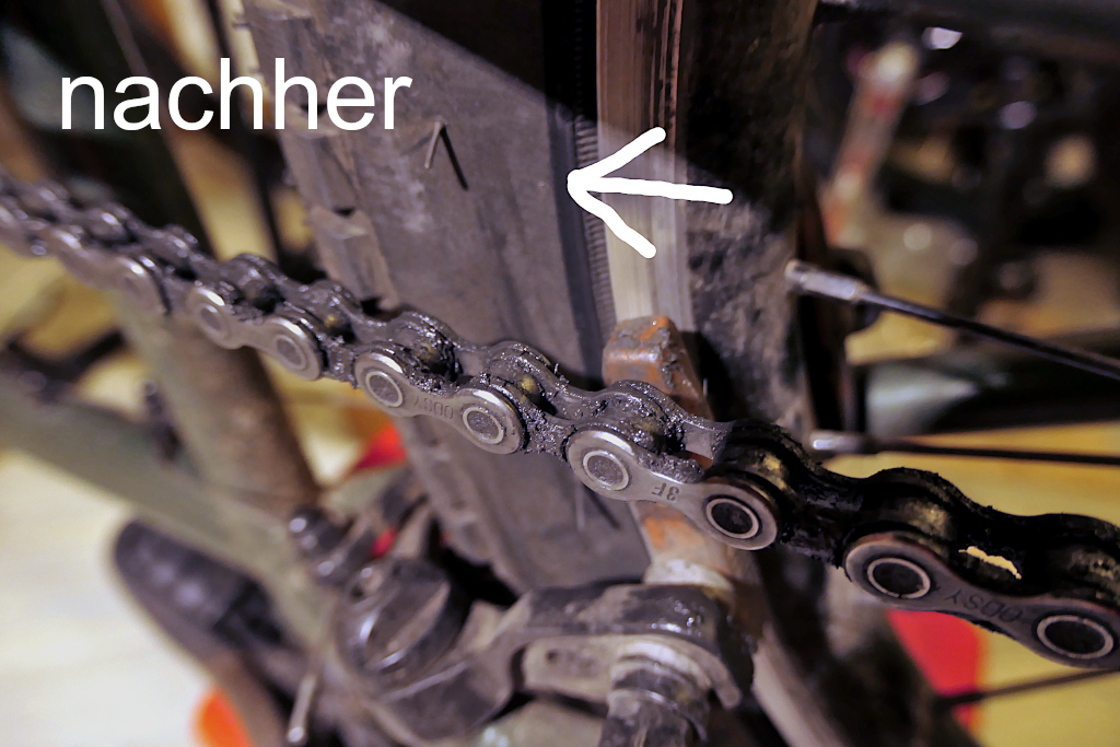 Deshalb musste die Kette um ein ganzes Kettenglied gekürzt werden. Durch ein weiteres schraubbares Kettenschloss wurde wiederum ein halbes Kettenglied ersetzt, damit die Kette nicht zu kurz wurde.