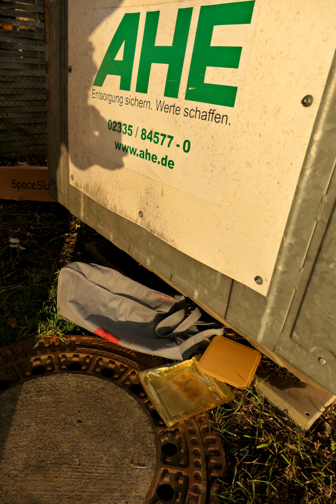 Die graue Tasche, die ich bei meiner letzten Müllaktion gefunden hatte, war mir eine große Hilfe. So konnte ich die Falschen und andere kleinere Müllstücke etappenweise zu meinem Müllmobil auf die andere Straßenseite herübertragen.