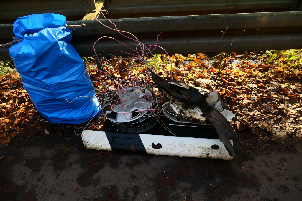 Insgesamt waren drei vollgefüllte Müllsäcke, Metallschrott, ein alter Autoreifen, die Radzierblenden und größere Plastikteile an dieser Stelle die Ausbeute des Tages.