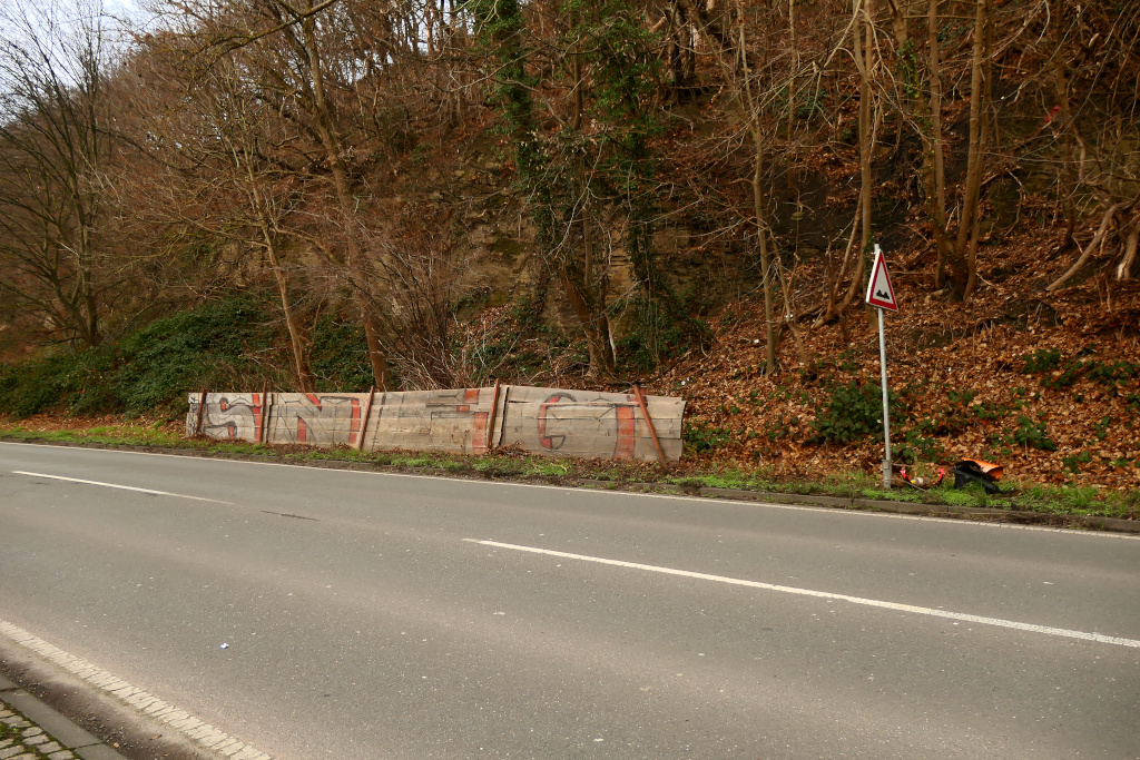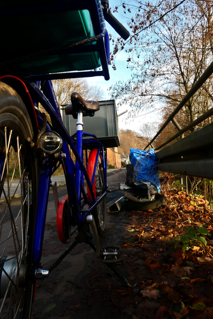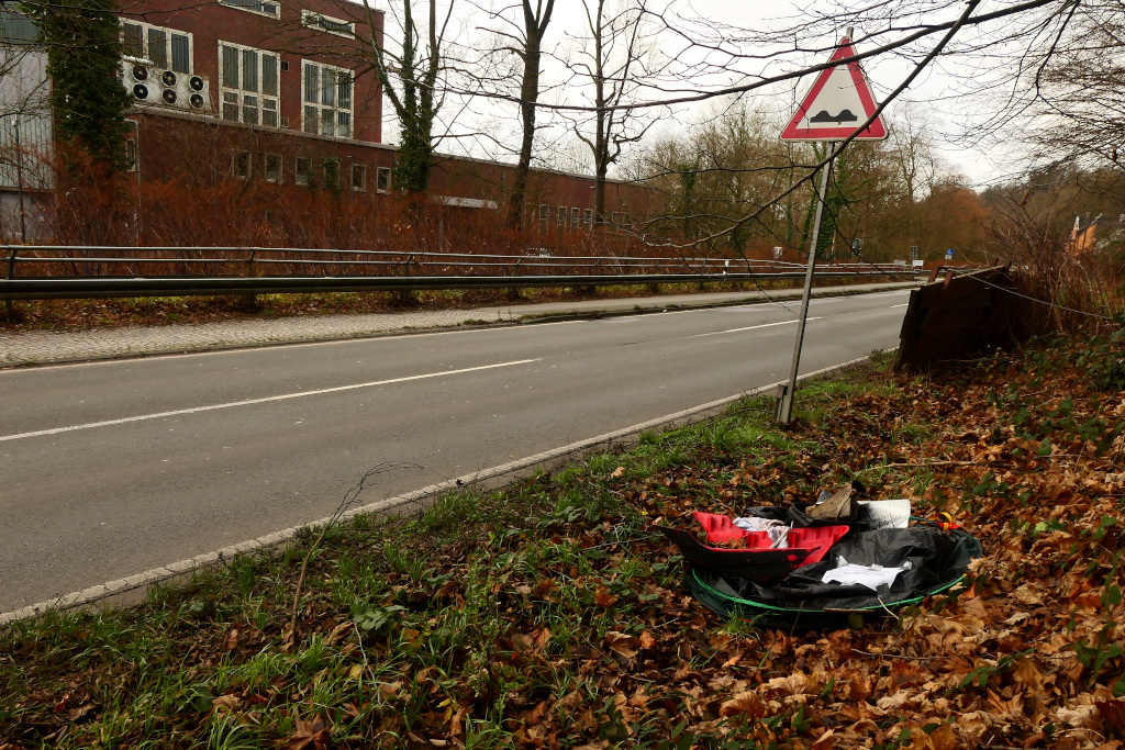 Den Radweg hatte ich die Tage schon mal vom Müll befreit. Auf der anderen Straßenseite befindet sich weder ein Rad- oder Fußweg, sondern gleich ein bewaldeter Hang.