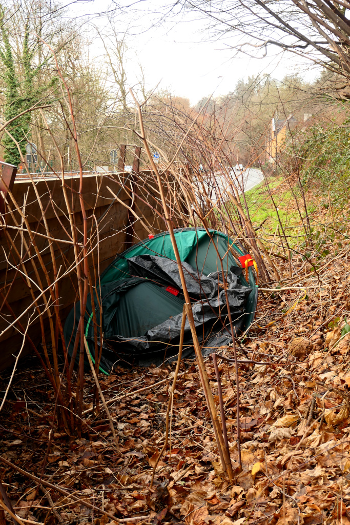 Des Weiteren hatte ich hinter einem Steinschlagschutz die Mülldeponie eines Anglers entdeckt. Er hatte hier sein kleines Zelt und andere Teile hinterlassen.