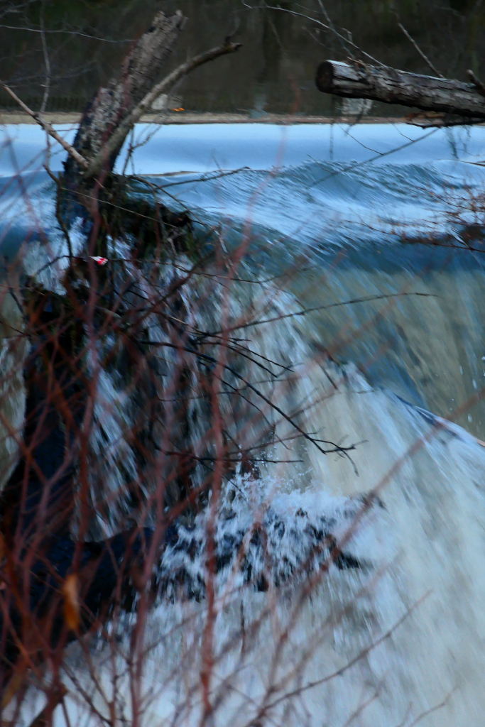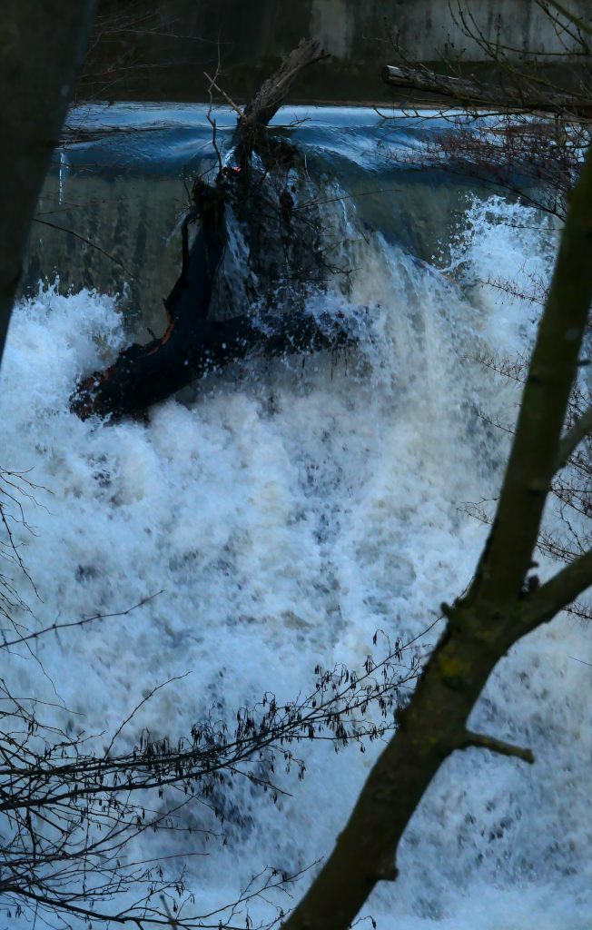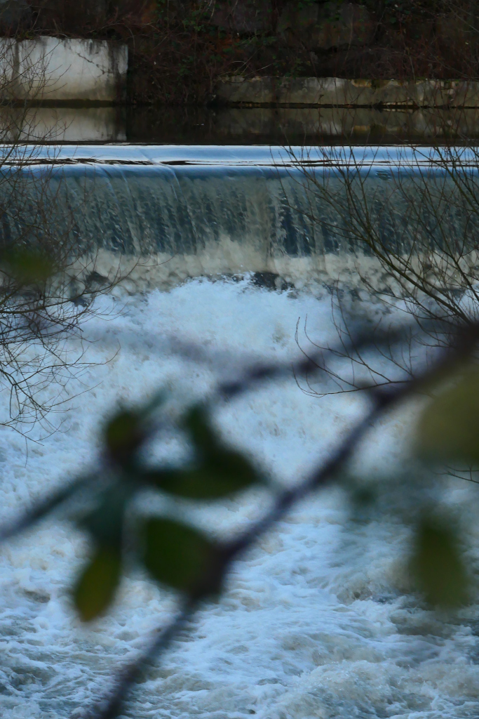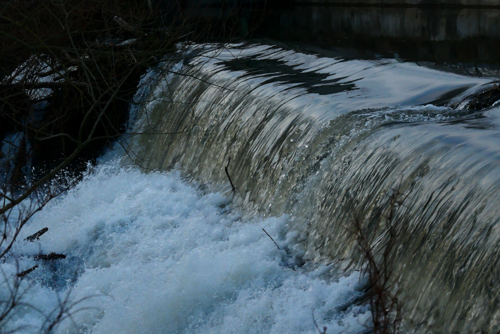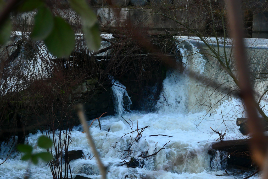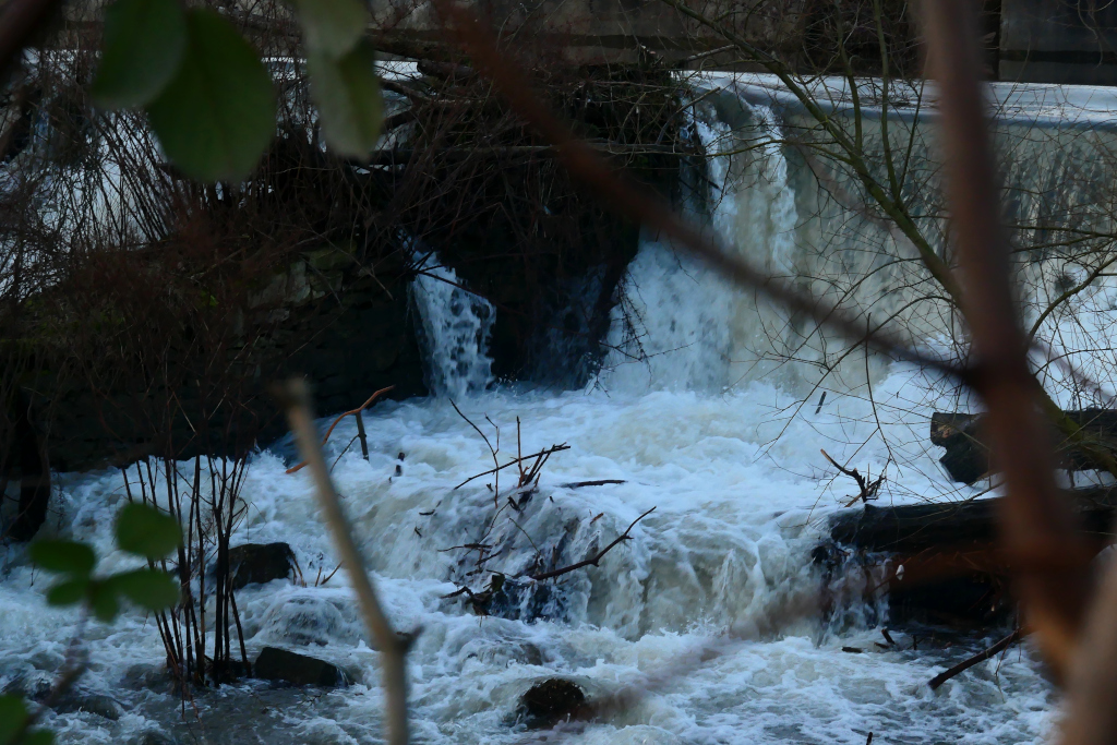Am Mühlengraben war das Stautor, wegen des leichten Hochwassers geöffnet und auch über dem Überlauf, floss das Wasser mit der Geräuschkulisse eines Wasserfalls hinab.