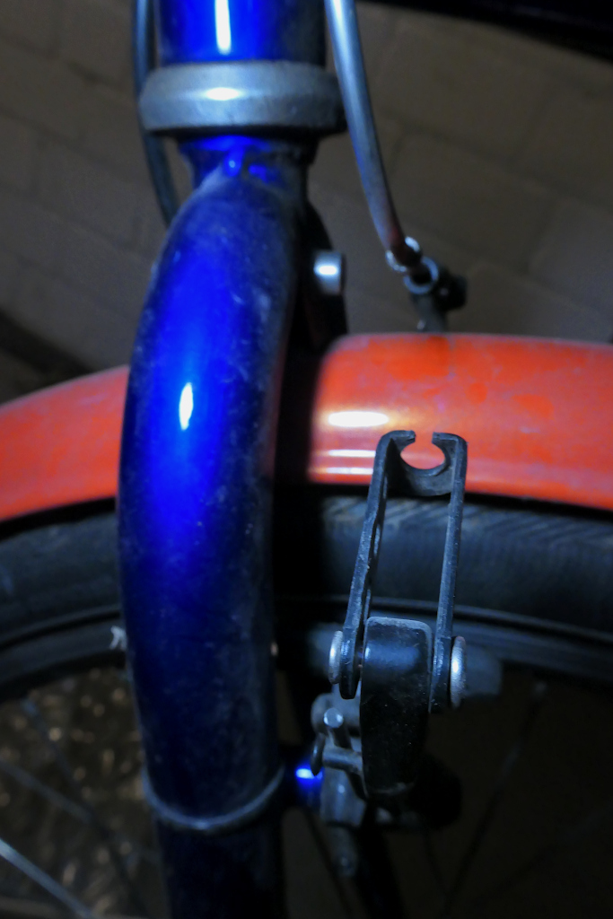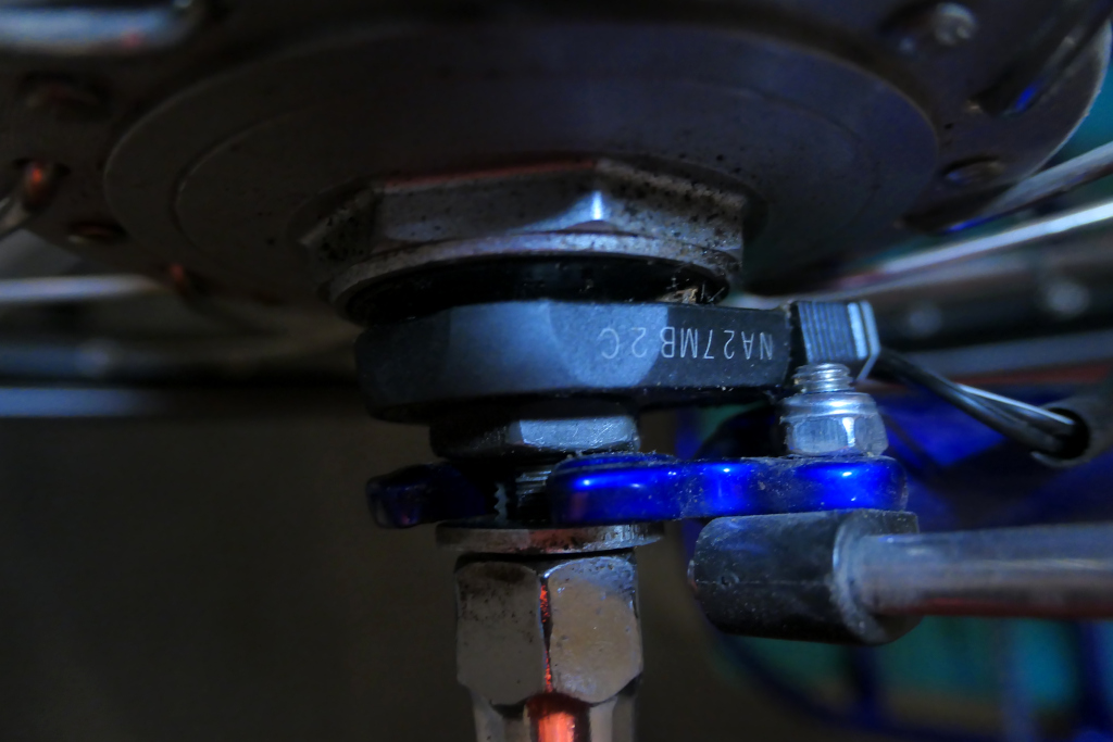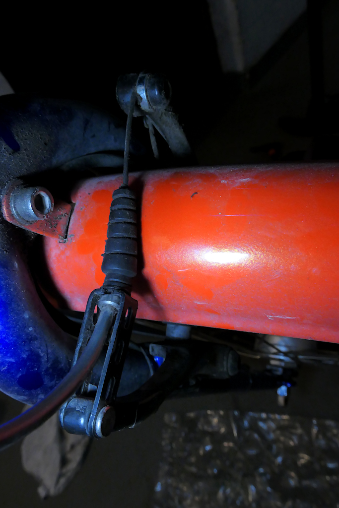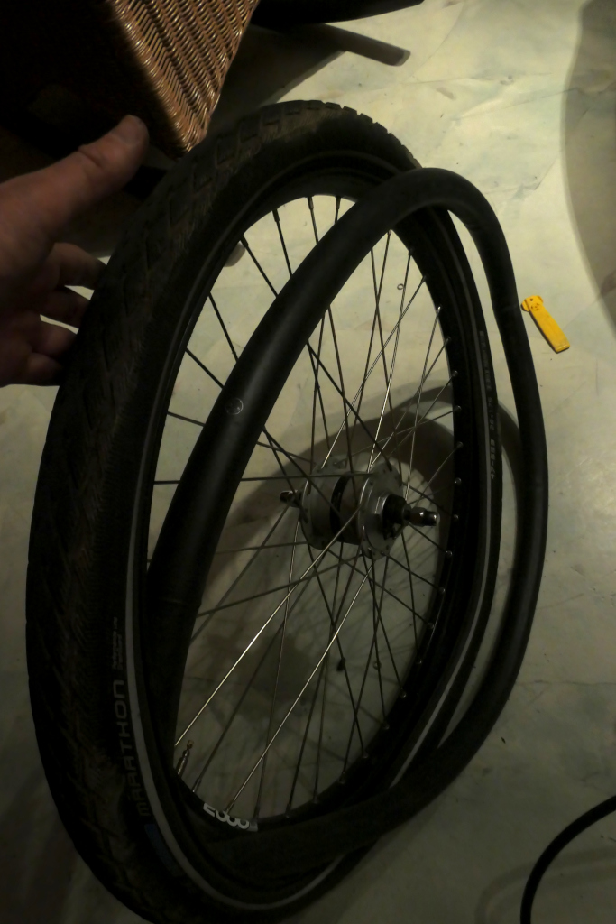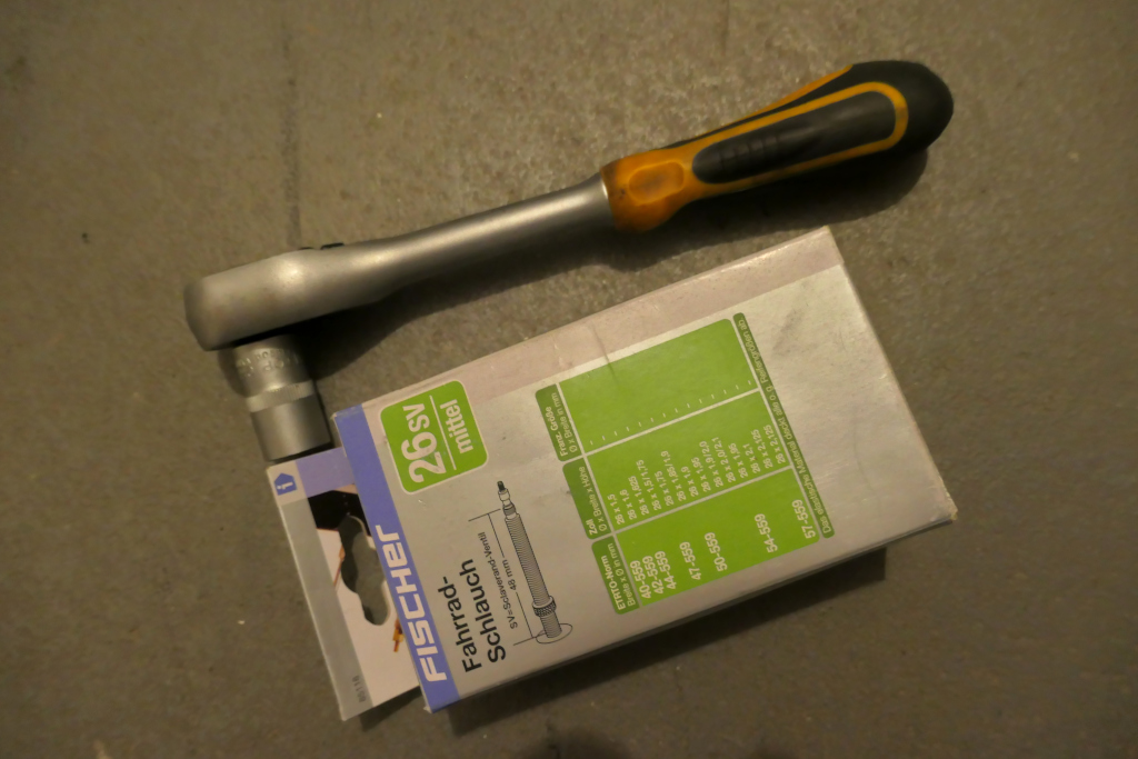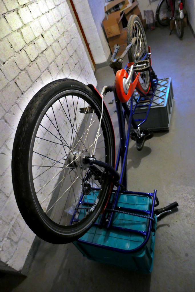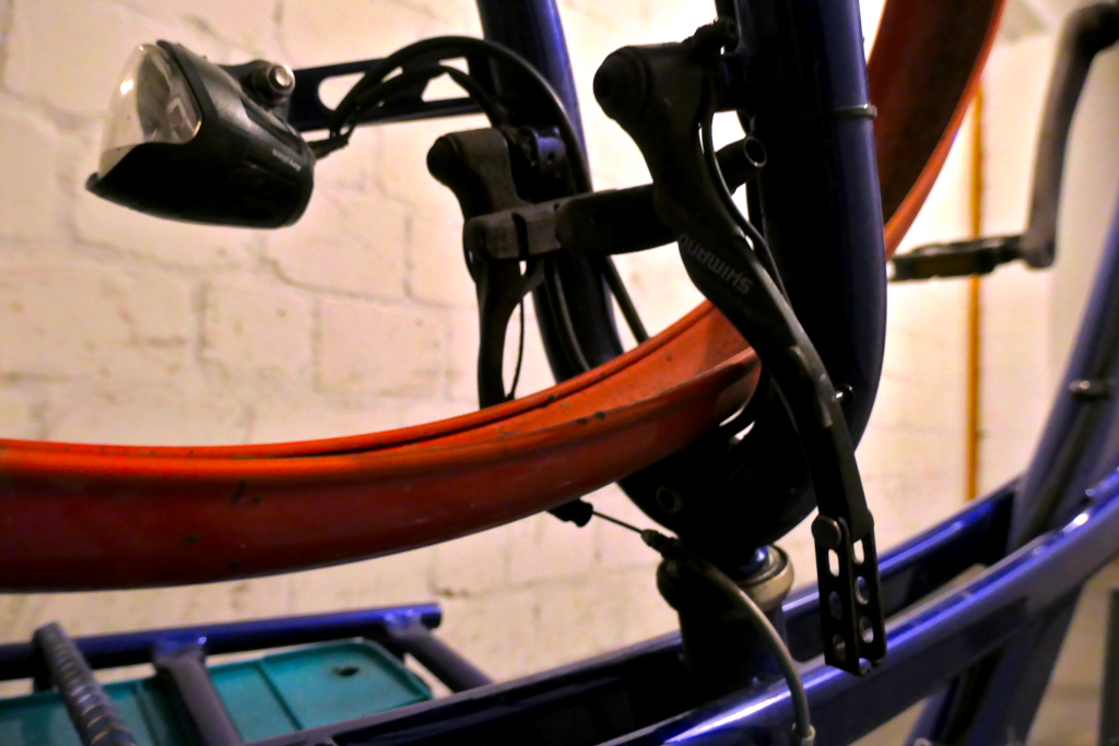 Das blaue Lasteselchen stellte ich im Kellergang auf den Kopf. Der Stecker wurde vom Nabendynamo abgezogen und die Vorderbremse ausgehängt, damit das abgeschraubte Rad samt Reifen bei der Montage durch die Bremsbacken passte.
