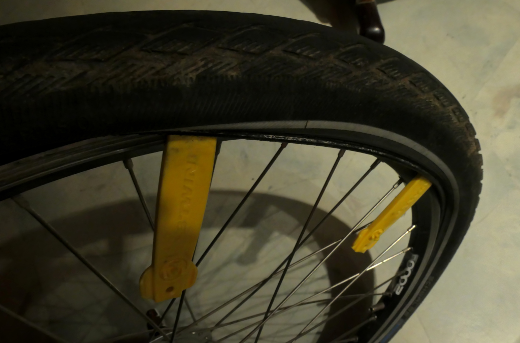 Da ich aber nun zu faul war den Schlauch zu flicken, nahm ich einen neuen Schlauch und baute ihn leicht aufgepumpt in umgekehrter Weise ein.