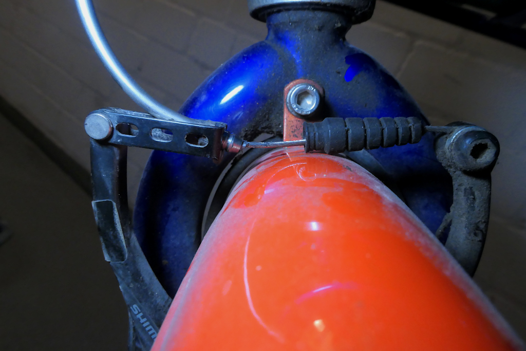 Nachdem das Vorderrad festgeschraubt und der Stecker vom Nabendynamo wieder an Ort und Stelle und Luft im Reifen war, stellte ich das Lasteselchen wieder auf die Reifen. Zum Schluss hängte ich die Vorderradbremse wieder ein.