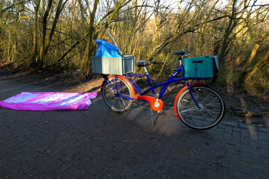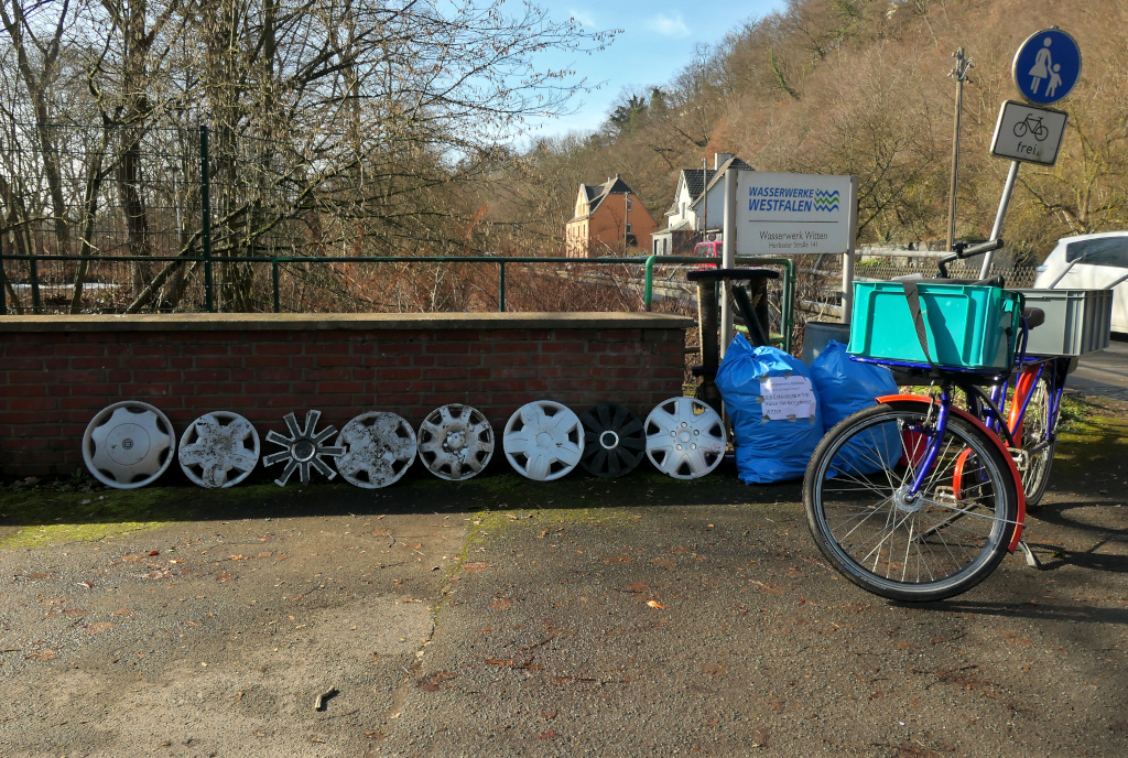 Außerdem hatte ich erstaunlicher Weise einen Bettbezug und ganze neun Radzierblenden gefunden. Die Neunte fehlt auf dem Bild, da ich sie erst auf der Rückfahrt gefunden hatte und dann nochmal umgekehrt war um sie zu dem Müll zu zustellen.