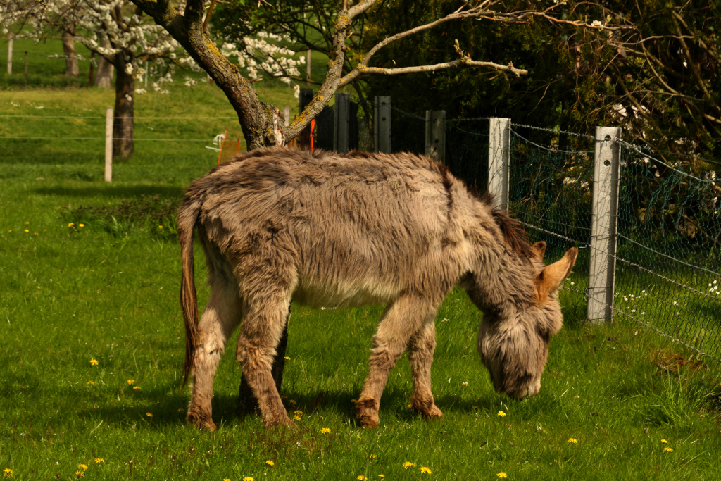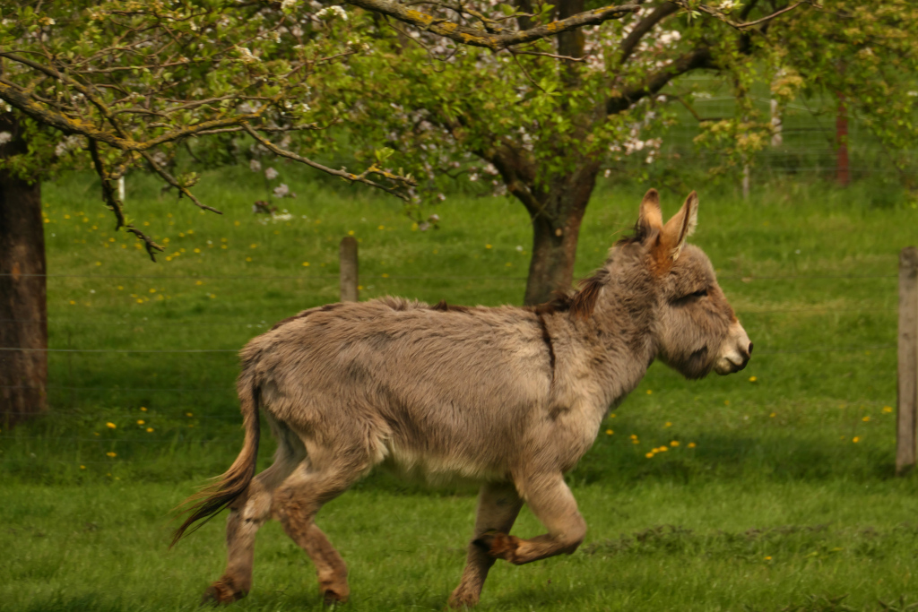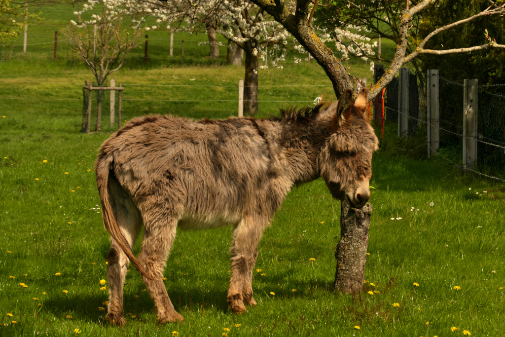 Erst stand der Esel an einem Baum, schubbelte sich ein bisschen an ihm, fraß ein wenig Gras und kriegte dann plötzlich seine dollen Fünfminuten.