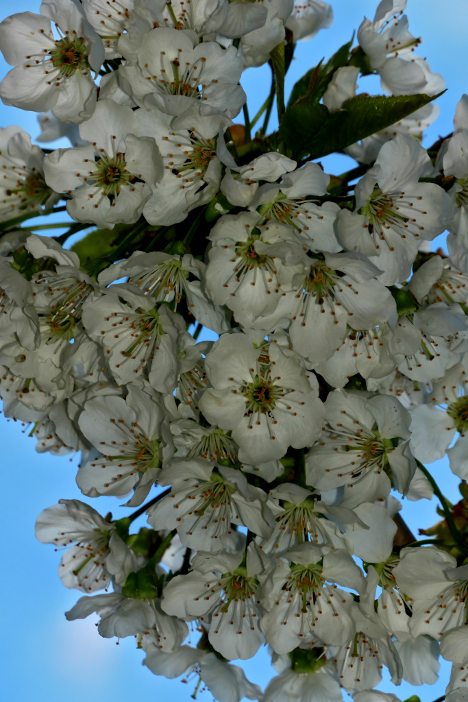 Von unten in den blauen Himmel hinein geknipst, ergaben sich dabei Blautöne in den eigentlich weißen Blüten.