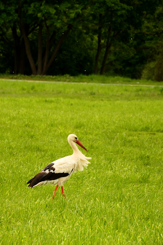 Natürlich hatte ich jetzt einen Grund die Kamera aus der Tasche zu holen. Zum Glück zeigte der Storch überhaupt keine Scheu und so konnte ich ihn in knapp 30 Meter Entfernung fotografieren. Neben mir hatten auch nur ganz vereinzelte Spaziergänger, die ebenfalls auf dem Trampelpfad unterwegs waren, den Storch überhaupt bemerkt.