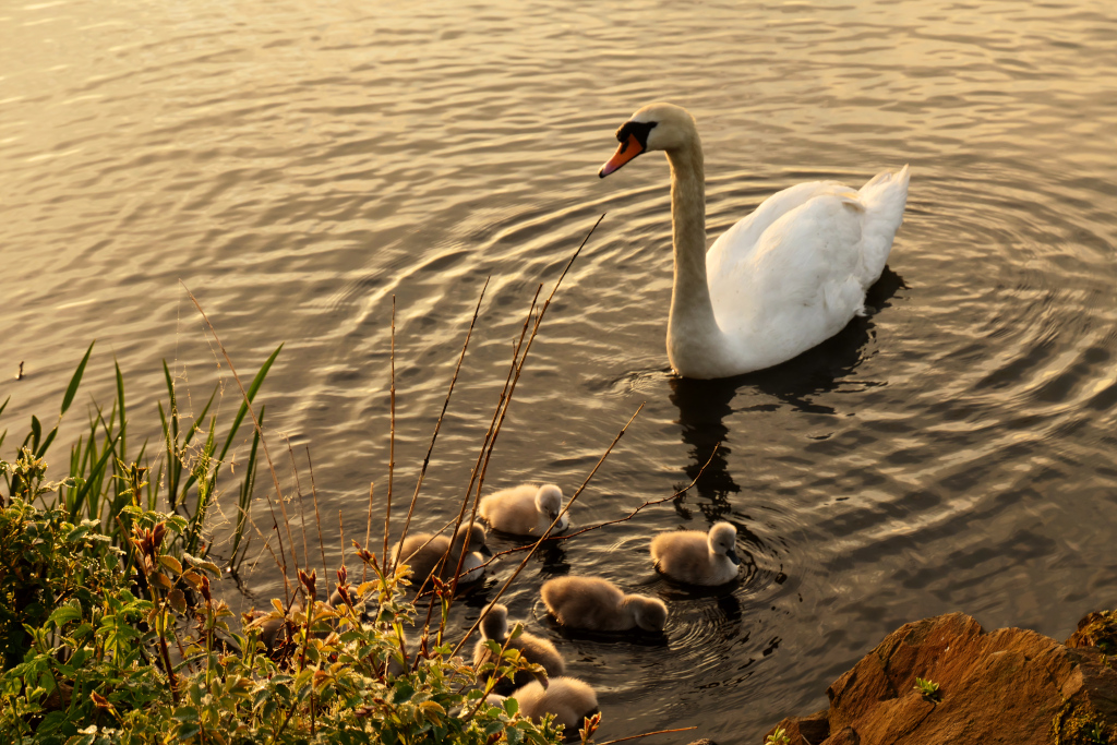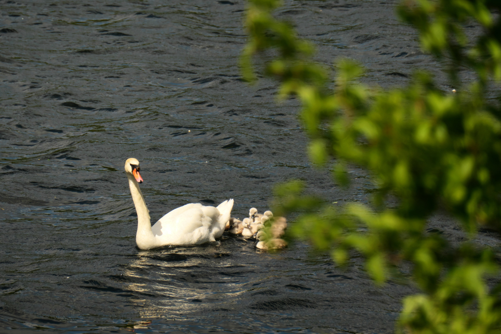 Am Mittag war die Schwanenmama mit ihren kleinen grauen Wattebäuschchen schon auf dem Wasser unterwegs.