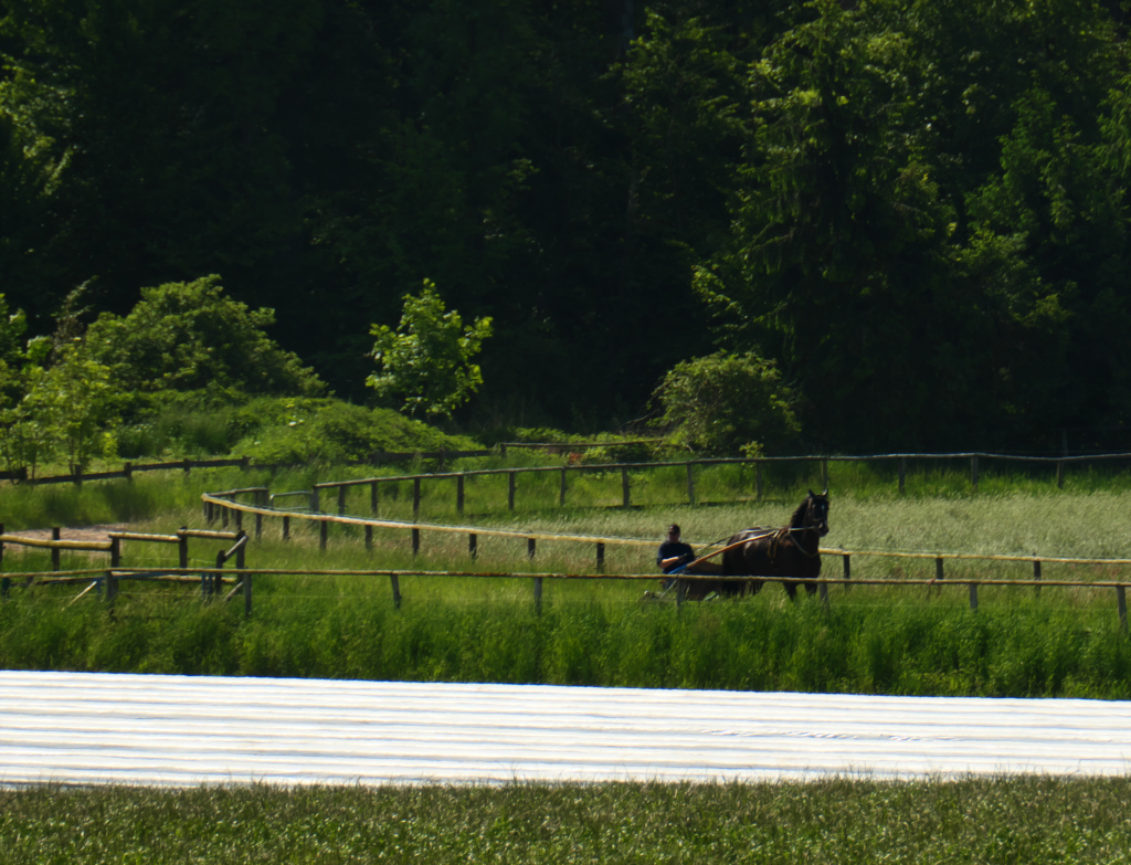 Neben dem Kanal hatte jemand tatsächlich seine eigene Trapprennbahn und trainierte mit Pferd und Sulky.