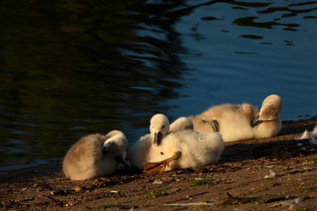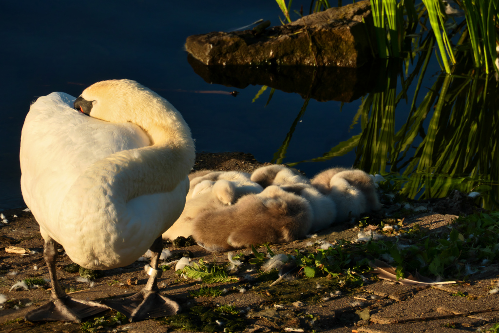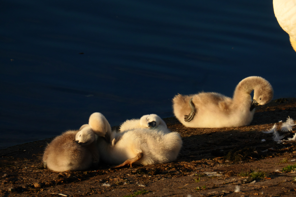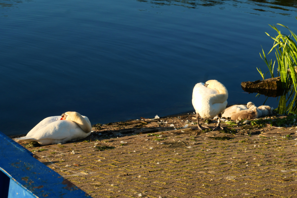 Ganz eng zusammengekuschelt schliefen die Schwäne direkt am Hafenufer.