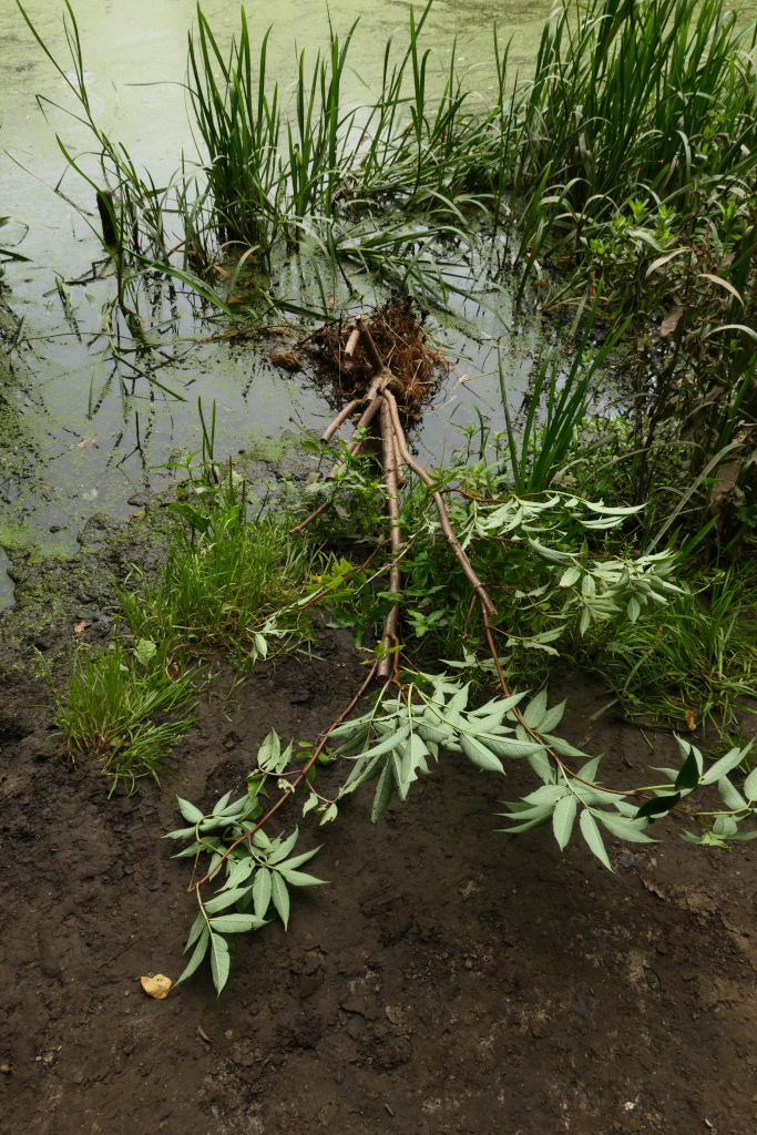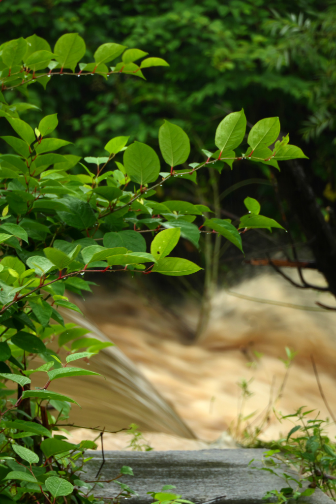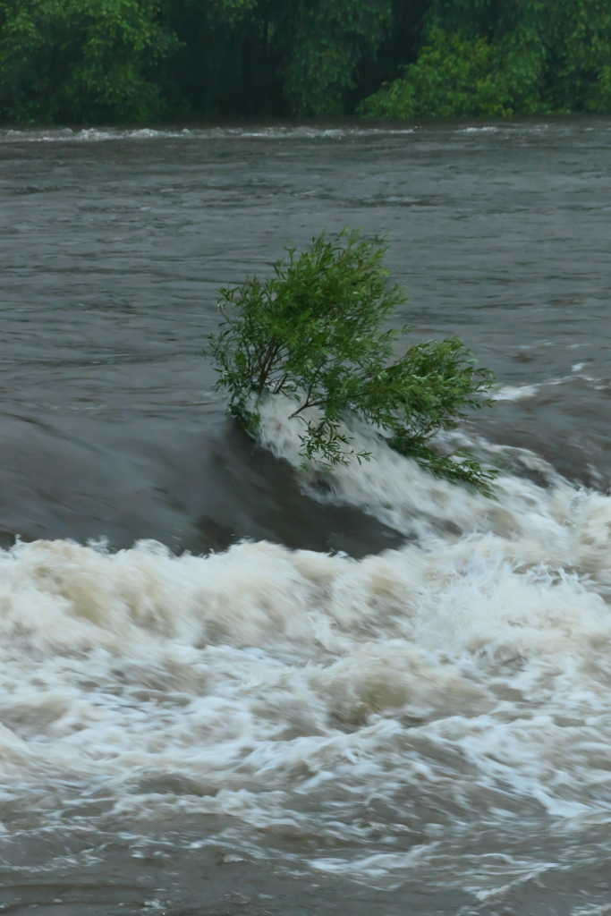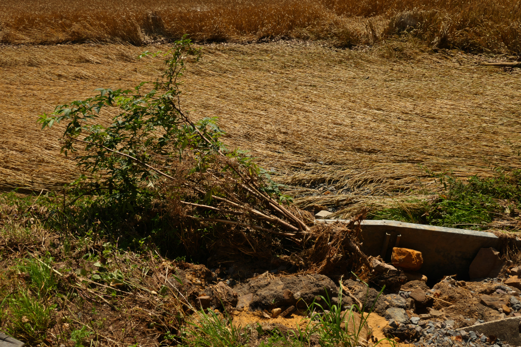 Von der starken Strömung wurde ein Teil der Straßenbefestigung weggerissen. An dieser Stelle stand ein kleiner Strauch dessen Knospen ich im Frühjahr mehrfach fotografiert hatte und nun lag er zerzaust am Boden.