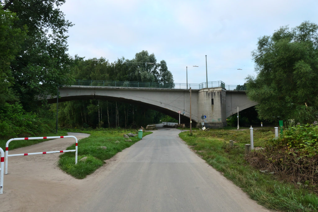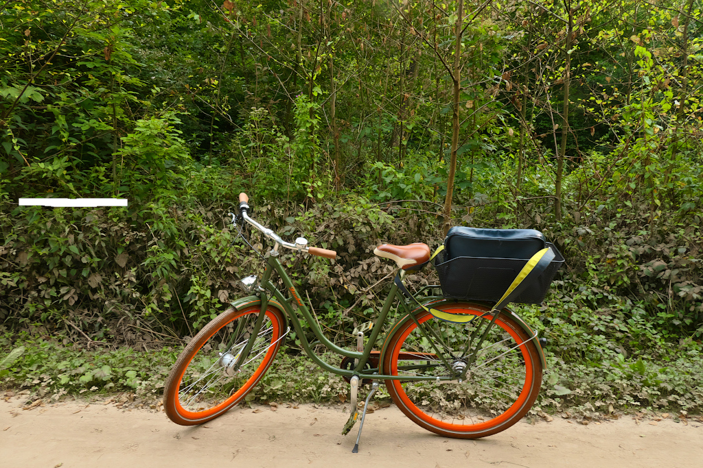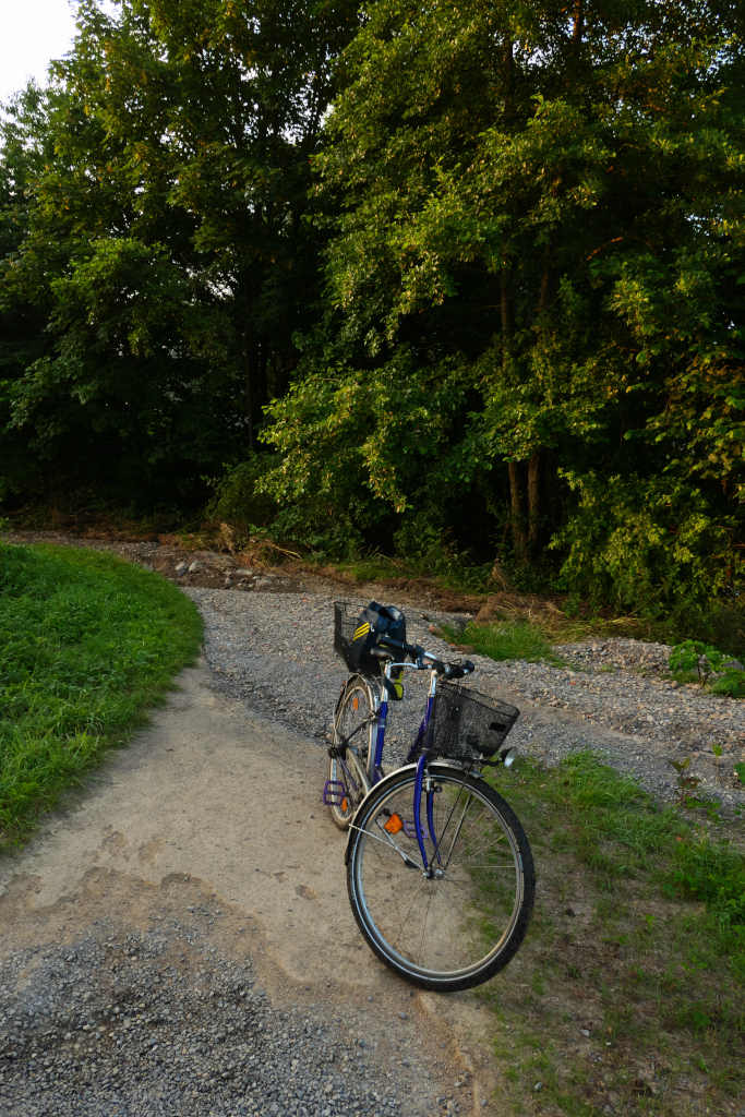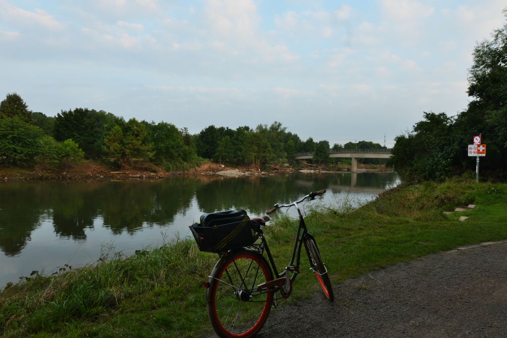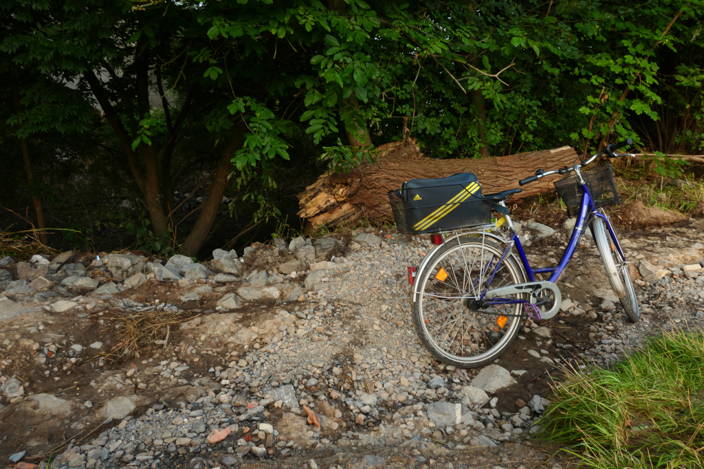 Ich hatte die Fahrräder auch mal als Maßstab benutzt, damit ihr sehen könnt, wie hoch der Hochwasserpegel (braune Färbung der Pflanzen) war und welche Krater das strömende Wasser auf den Wegen hinterlassen hat.