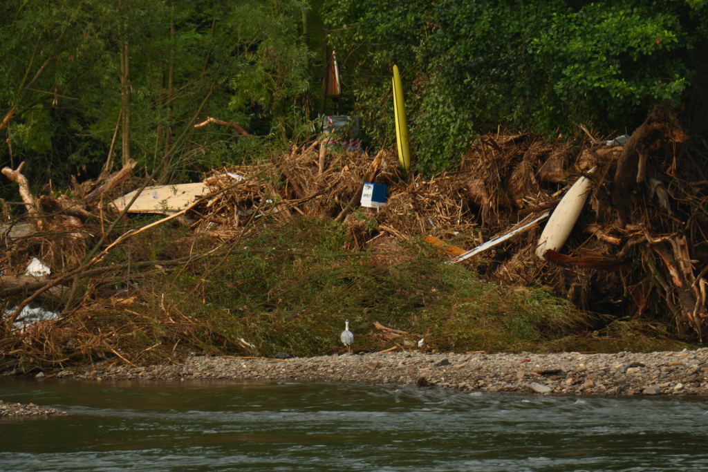 Auf den ersten Bildern irrt ein Fischreiher zwischen dem Abraum am Ufer herum, schaut mal genau hin, dann könnt ihr euch vorstellen welche Mengen an Unrat die Flut mitgerissen hat.