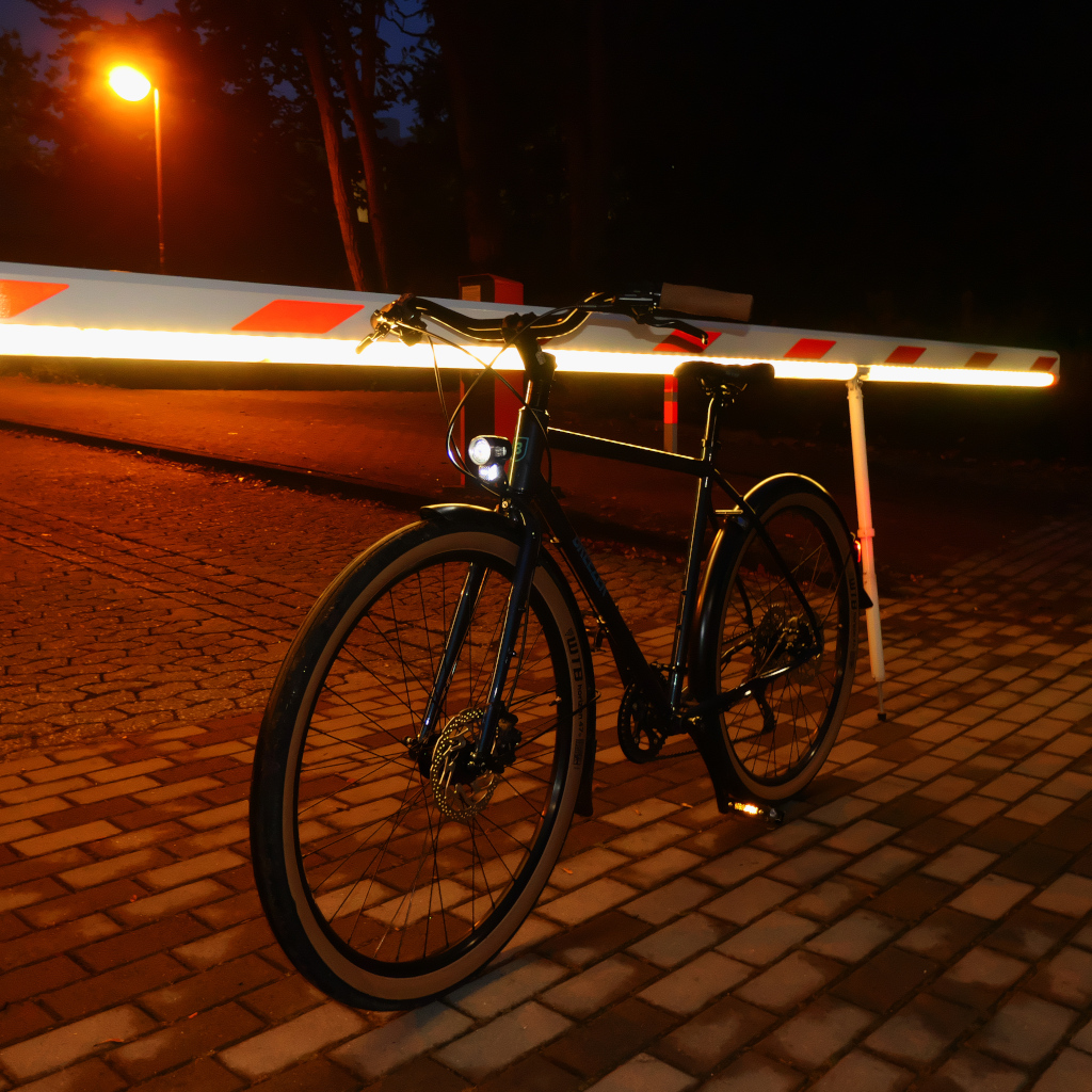 Hier ist mein „Rennrad“ morgens dekorativ an einer beleuchteten Schranke auf dem Unigelände zu sehen.