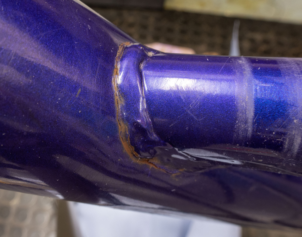 Nicht nur die Schweißnaht hatte eine Rissanzeige, nein auch ins Hauptrohr des Fahrradrahmens verliefen seitlich zwei weitere Risse hinein.