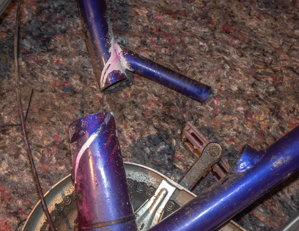 Zuhause angekommen hatte ich die Rissstelle mit einer Bügelsäge heraus getrennt und alle noch brauchbaren Komponenten, wie beispielsweise die Laufräder abmontiert.