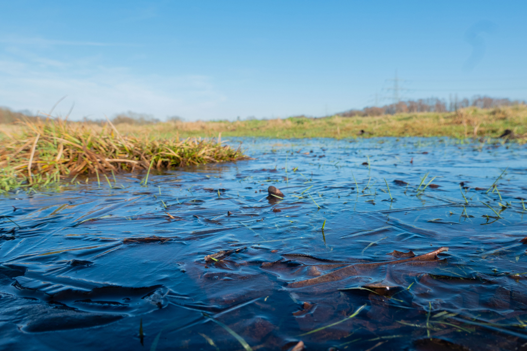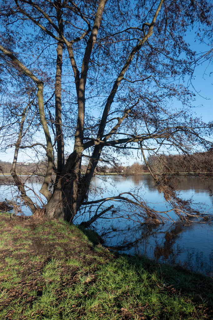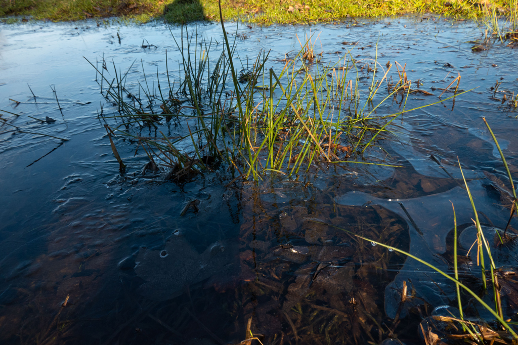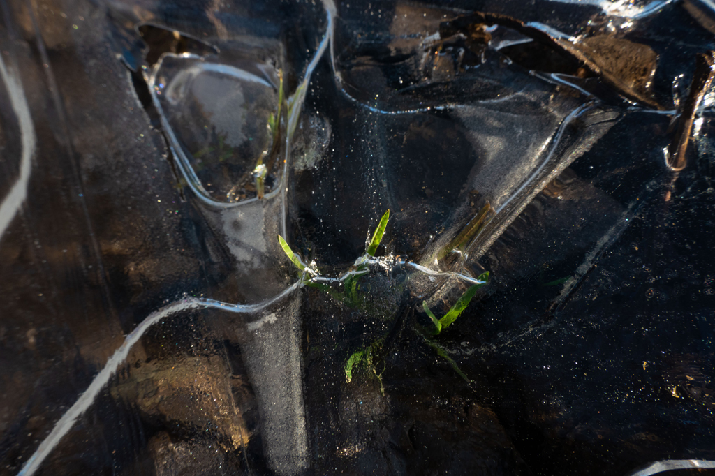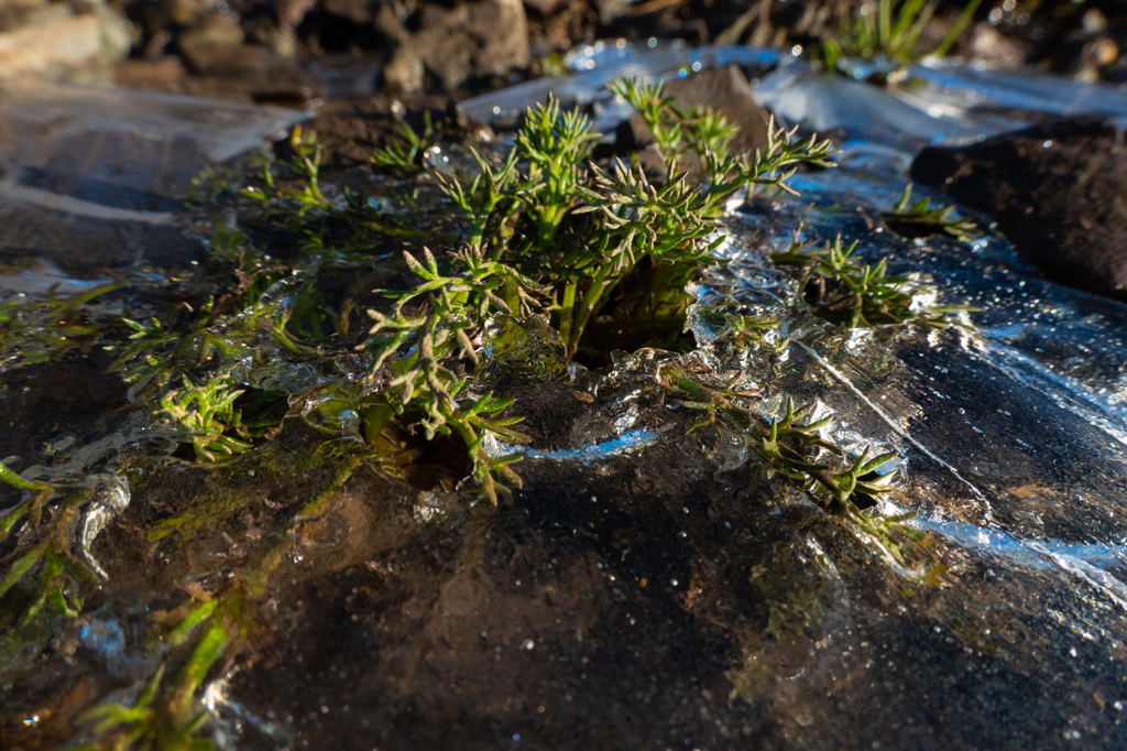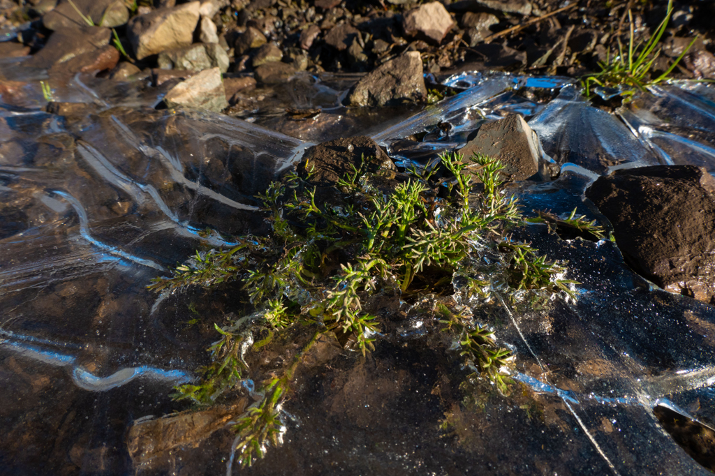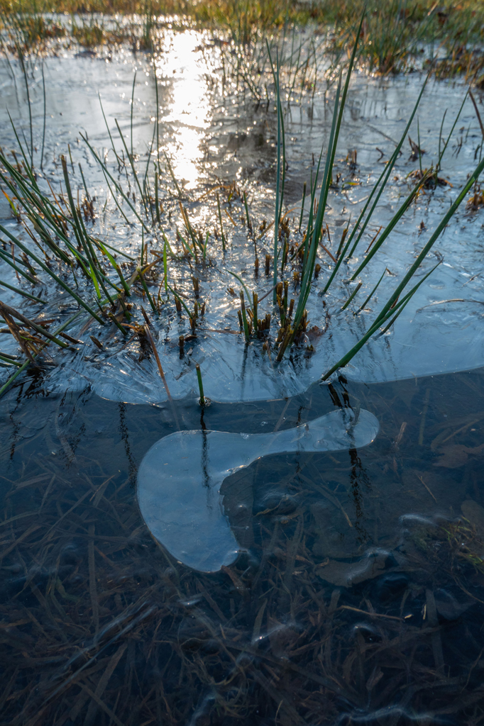 Besonders schön sahen die zugefrorenen Pfützen aus, durch die Spiegelung des blauen Himmels ergaben sich wieder Gelegenheiten für weitere Bilder.