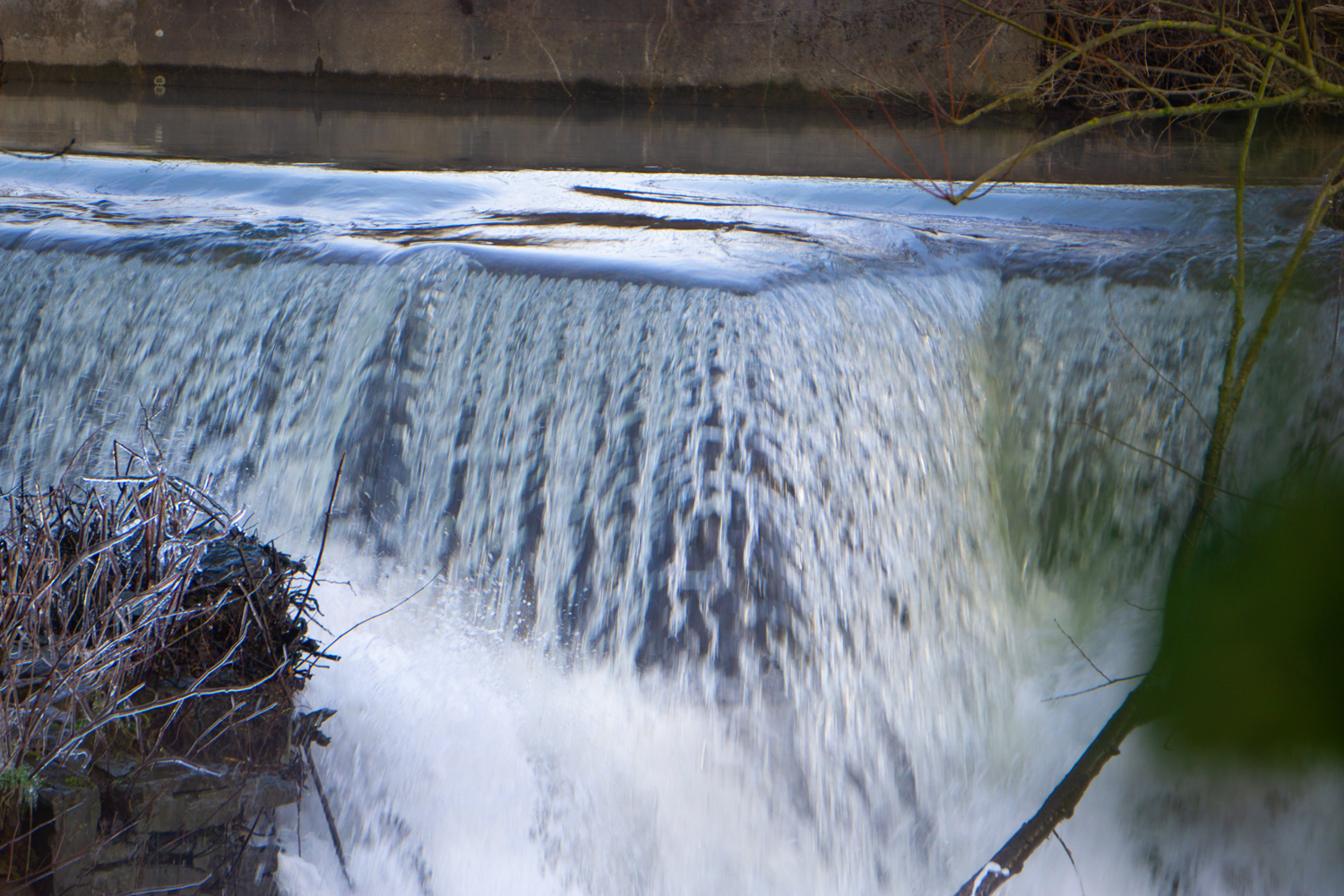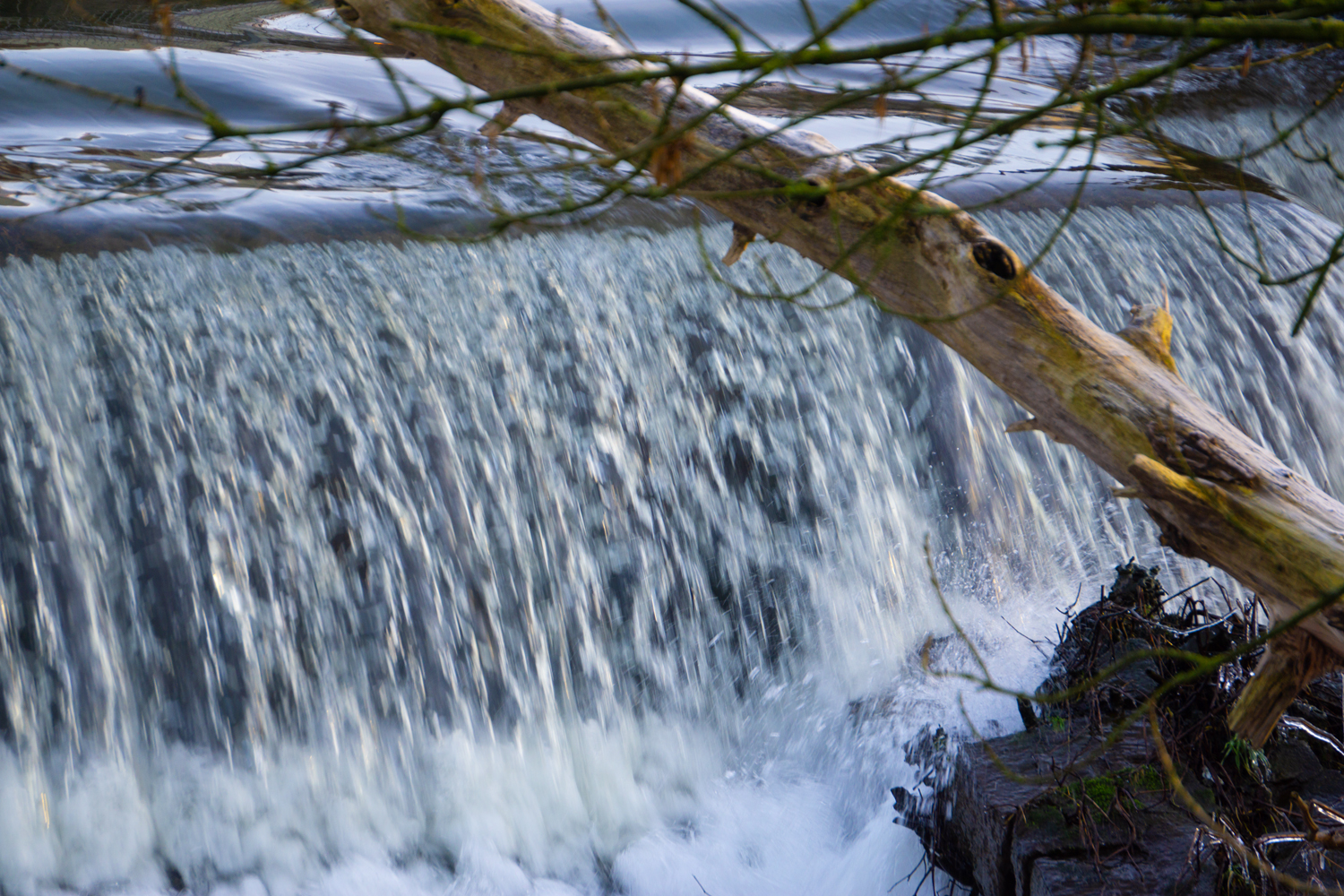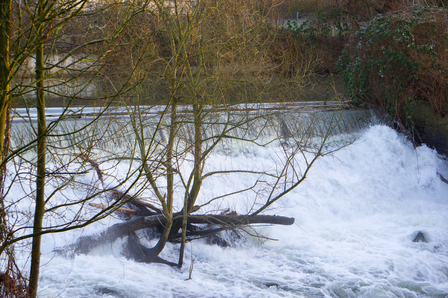 Der durch den Regen erhöhte Wasserstand der Ruhr sorgt für einen schönen Wasserfall an einem Wehr.