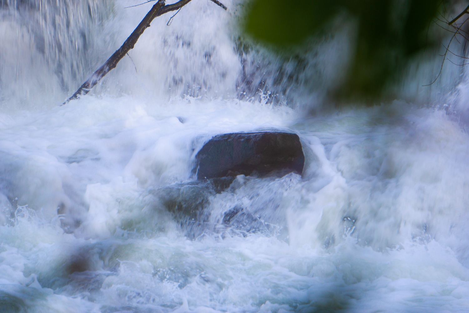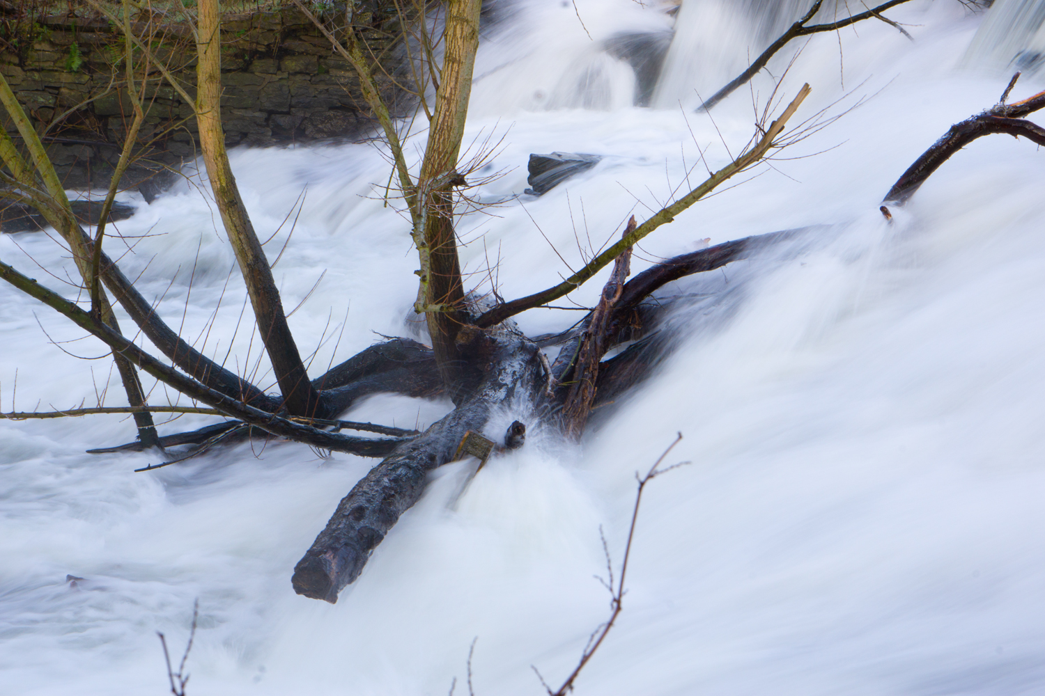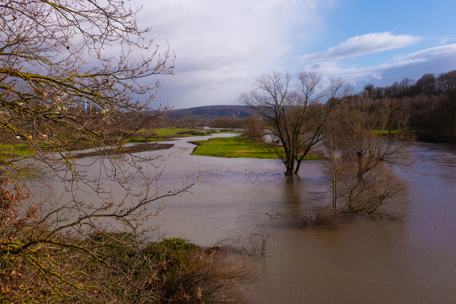 Der durch den Regen erhöhte Wasserstand der Ruhr sorgt für einen schönen Wasserfall an einem Wehr.