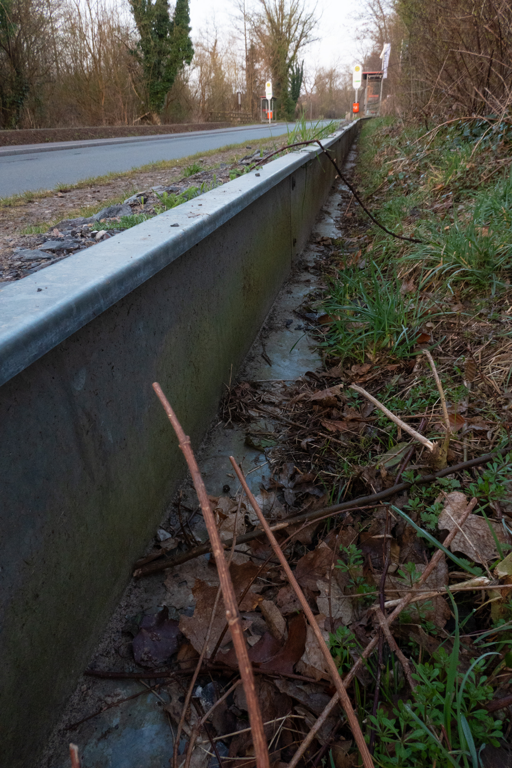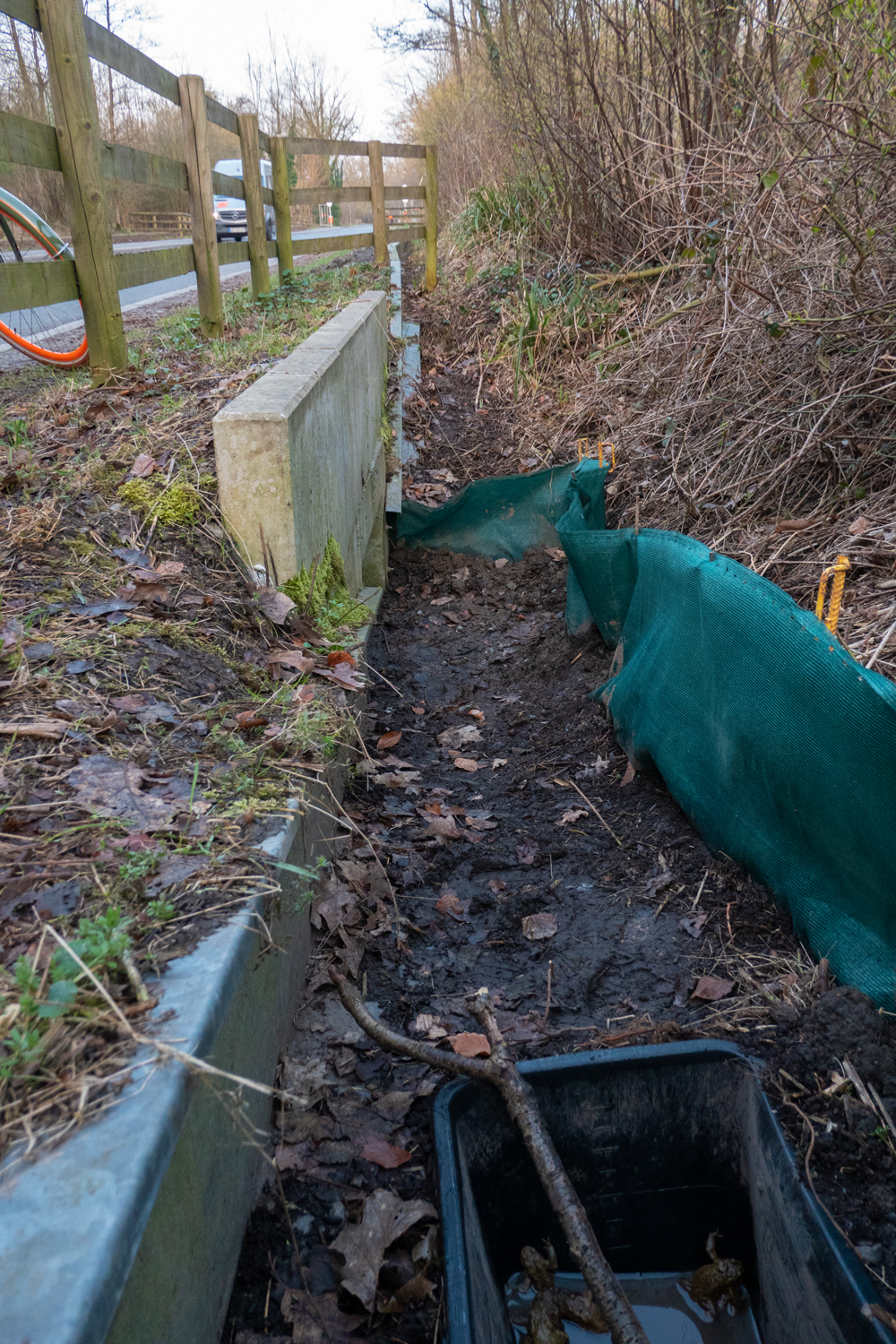 Vor ein paar Jahren wurden an den Straßenrändern Schutzgräben mit Tunnelsystem für Amphibien gebaut.