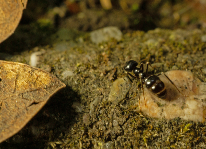 Als ich mit meiner Nase bzw. Kameralinse noch weiter im Unterholz verschwunden war, entdeckte ich eine Ameisenstraße, diese kleinen quirligen Wesen sind tatsächlich schwieriger mit dem Makro-Objektiv zu erwischen als die gemütliche Nacktschnecke.