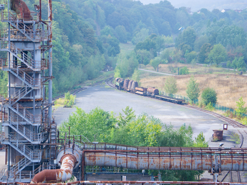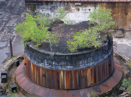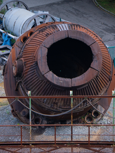 Das Bild zeigt im Vordergrund die „Ofensau“, so nennt man den Sockel, vom abgebauten Hochofen 2 und im Hintergrund der Hochofen 3.