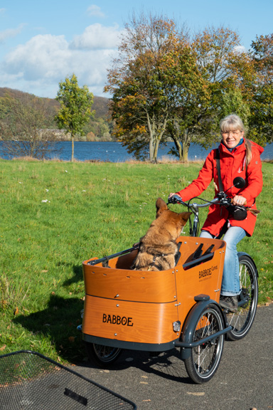 Bei einem Körpergewicht von rund 25 Kilo passt Bonnie nicht in einen Fahrradhundekorb auf einem Gepäckträger hinein.