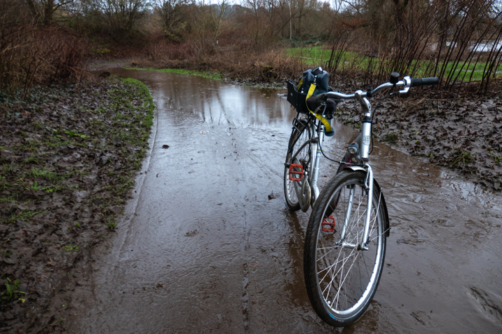 Ja was soll ich sagen, ich war nicht weit gekommen, da der Weg teilweise unter Wasser stand. Die erste große Pfütze hatte ich noch heldenhaft mit dem Kübel durchfahren.