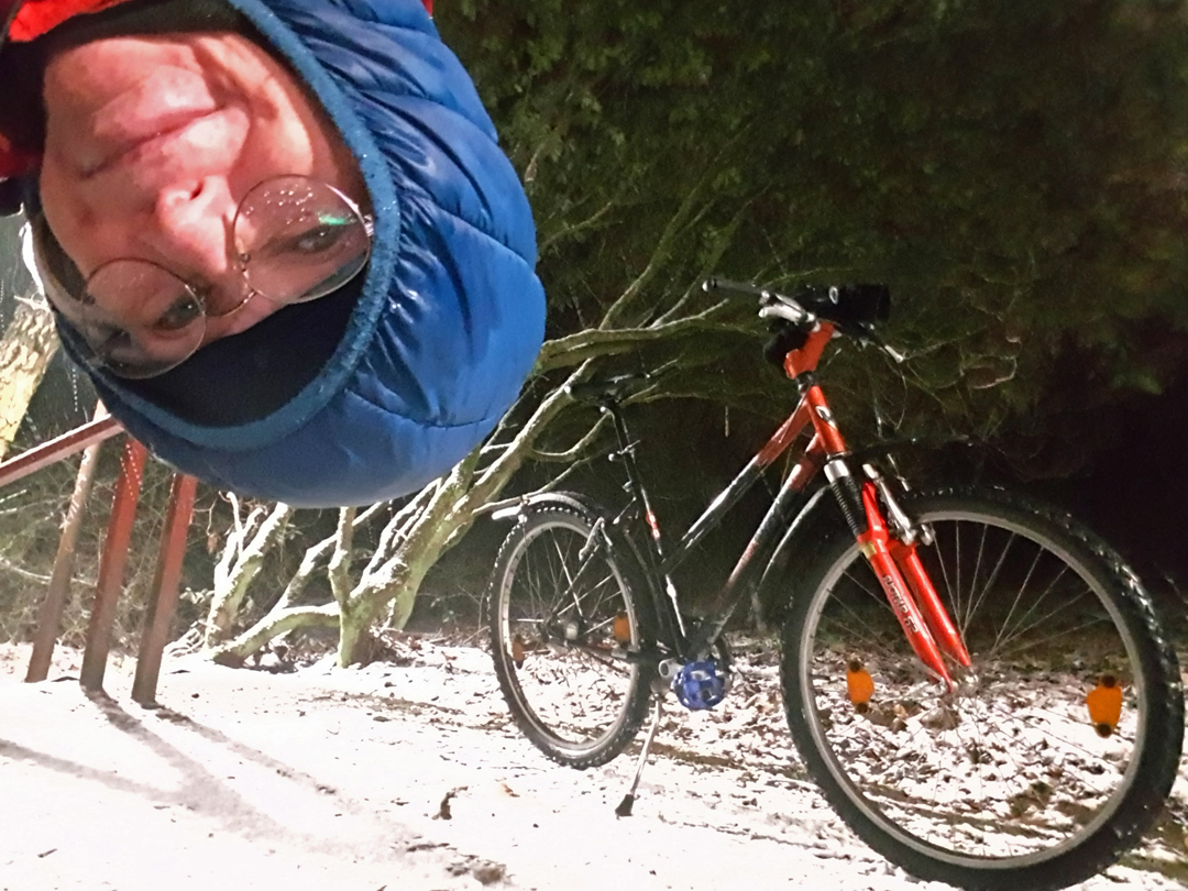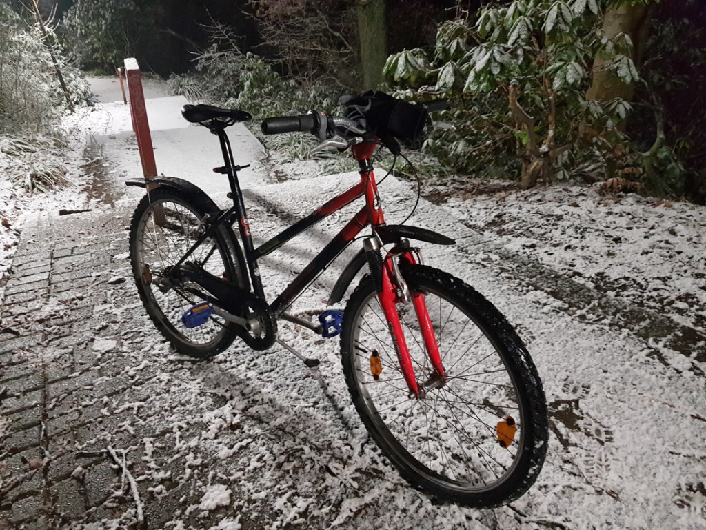 Das beste Wetter, um das Möchtegern-Mountainbike aus dem Keller zu holen. Im Schneegestöber ging es dann morgens los zur Arbeit!