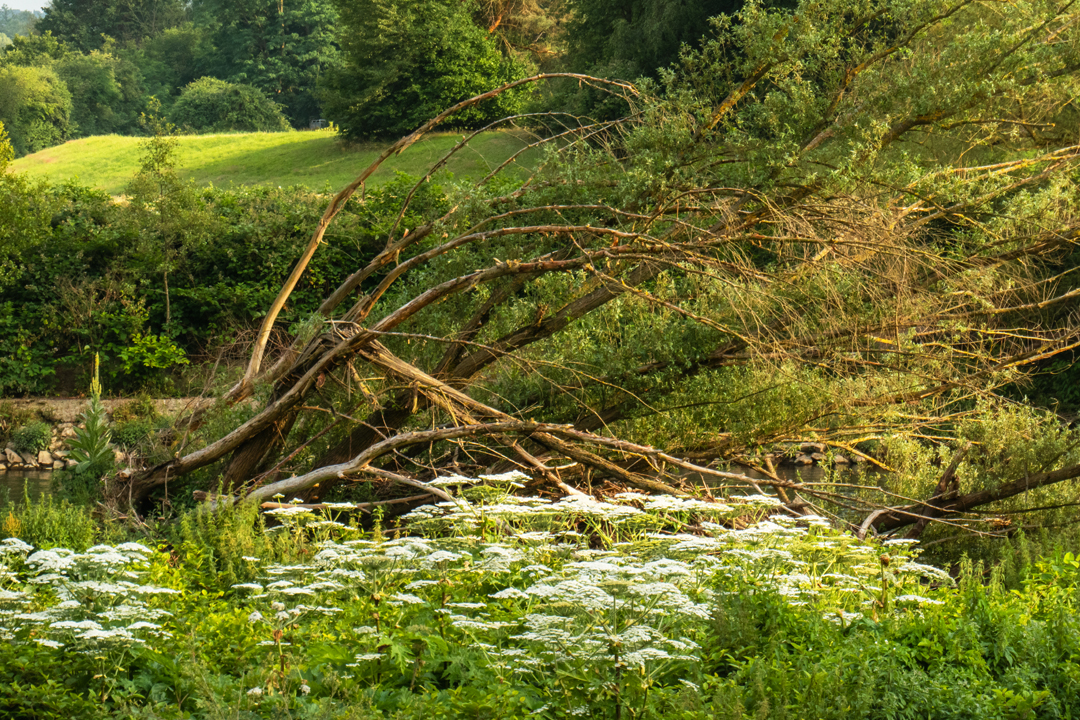 Durch die letzten teils heftigen Hochwasser ist das Wehr hier und da unterspült worden oder ganz abgetragen worden. Und gerade an diesen Stellen wachsen Blumen und es haben sich kleine Tümpel gebildet.