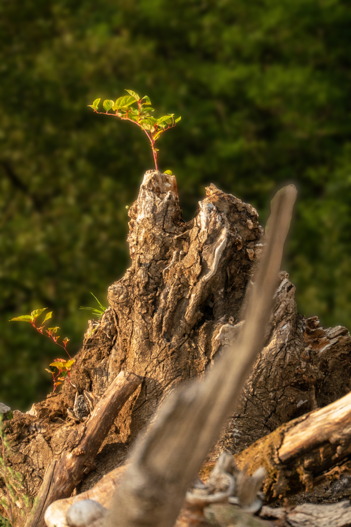 Auf einem angespülten Baum hatte ich in einem Blickwinkel zwischen zwei Ästen dieses kleine Pflänzchen oben auf der Wurzel erblickt.