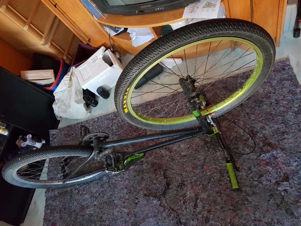 Hier steht er kopfüber im Wohnzimmer, um die Reifenpanne nach dem Schreiben dieses Beitrages zu beheben.