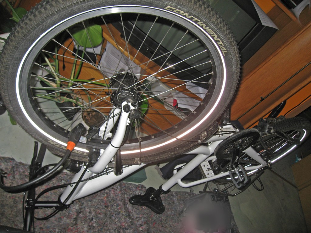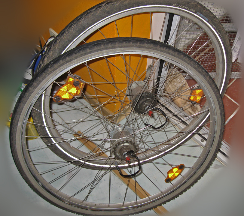 An dem intakten Laufrad (rechtes Bild, hinten) von der verschrotteten blauen Rappelkiste ist außerdem ein pannensicherer Reifen montiert.