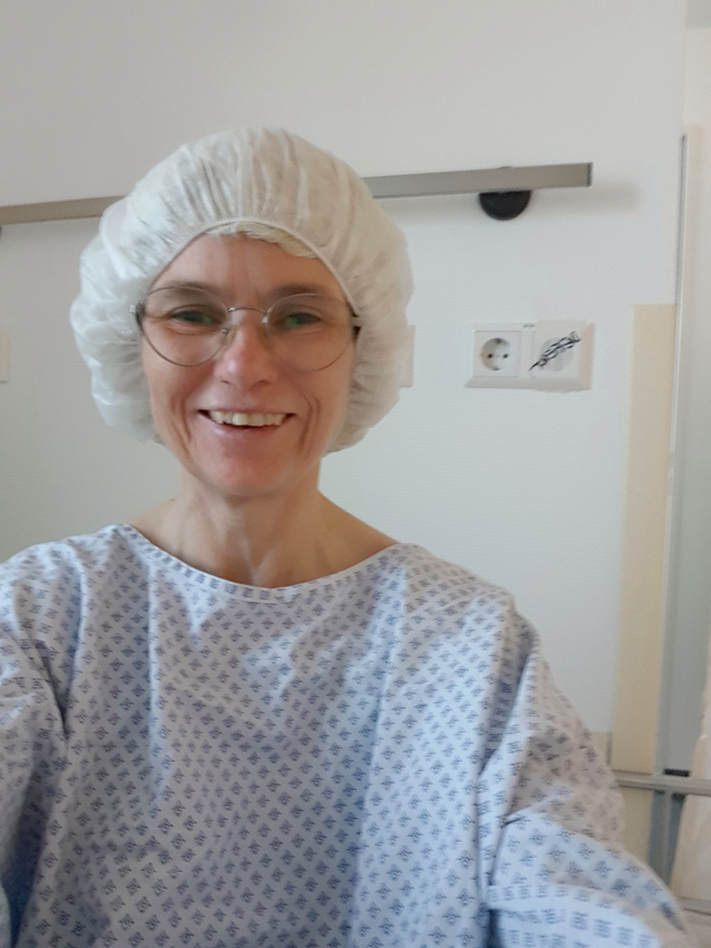 Damit dieser trübe Beitrag nicht ganz depressiv wird, gibt es mich jetzt im OP-Hemdchen und Mützchen zu sehen, ein echter Hingucker!