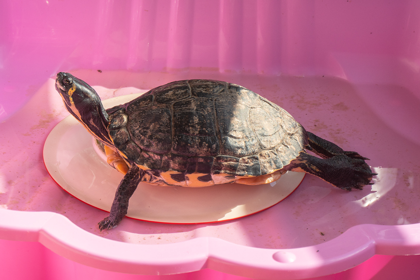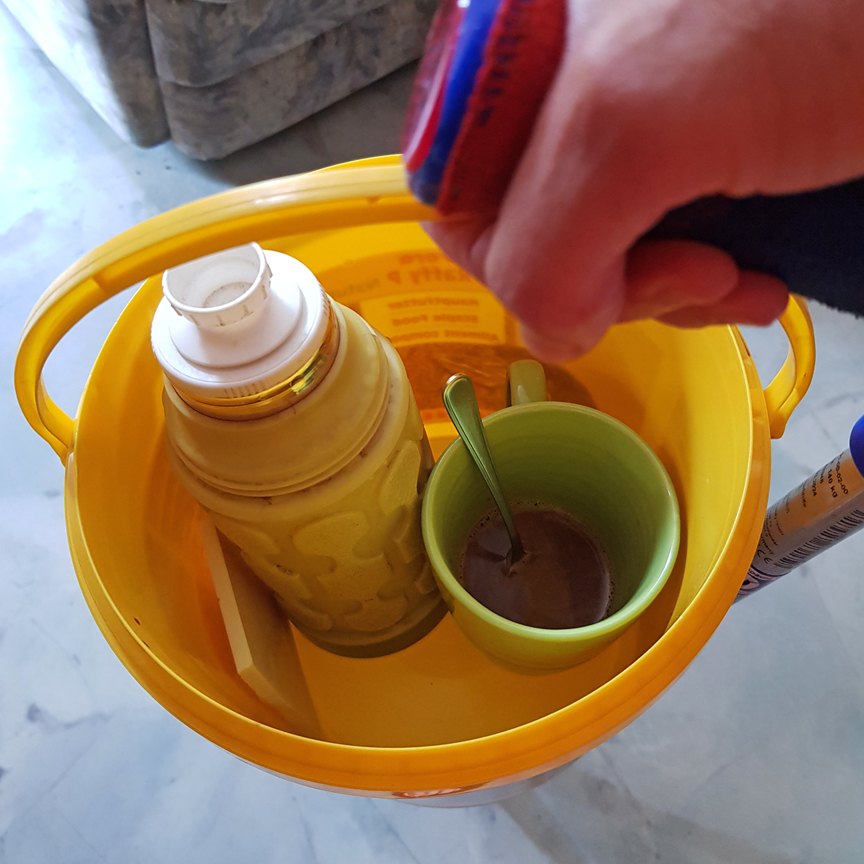 Ein kleiner Eimer, wo von Romi ehemals das Schildkrötenfutter drin war, ist perfekt für den Getränketransport geeignet.