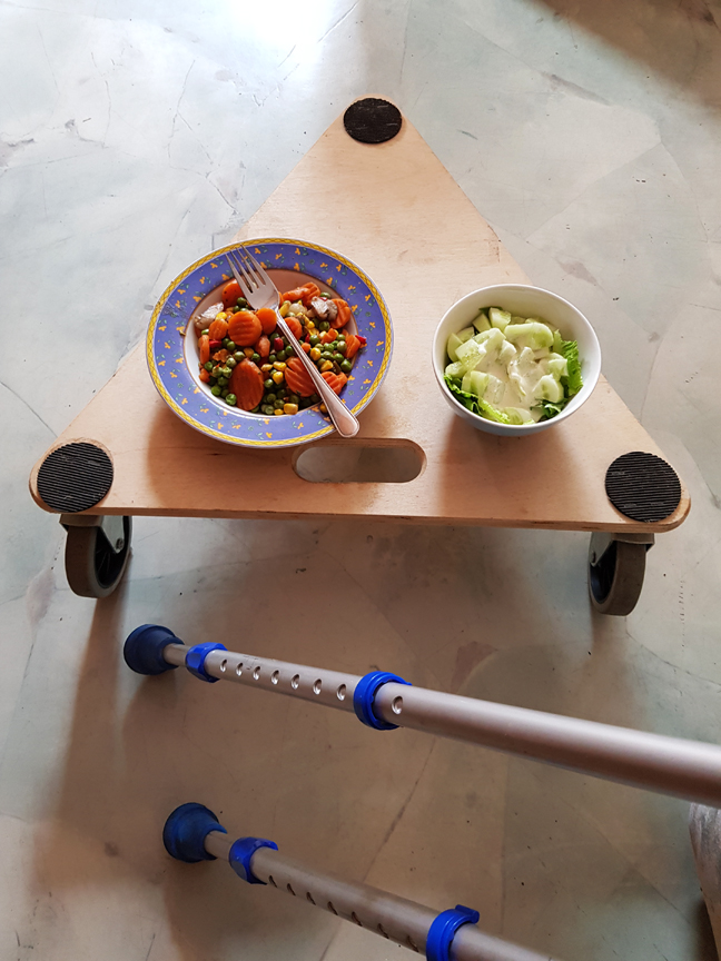 Als Servierwagen für mein Mittagessen habe ich ein Möbelrollbrett zweckentfremdet.