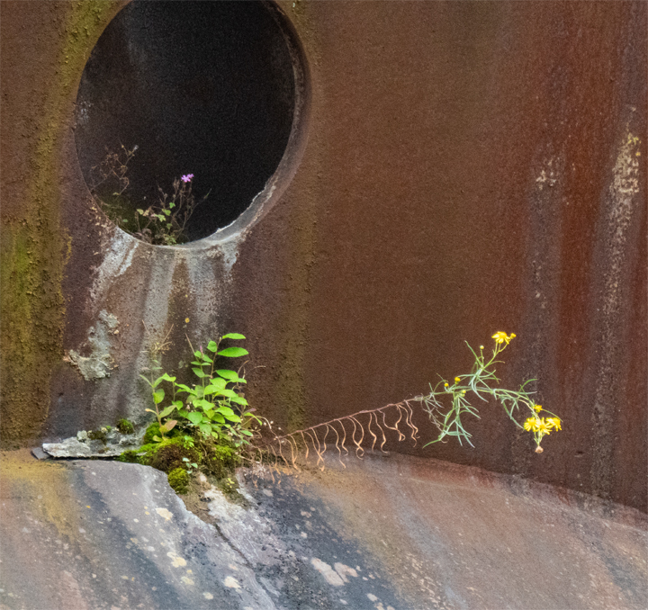 Im weiteren Verlauf des Ruhrtalweges komme ich an der Henrichshütte vorbei. Es ist total verblüffend und interessant, wo inzwischen überall an der Industrieruine Pflanzen wachsen.