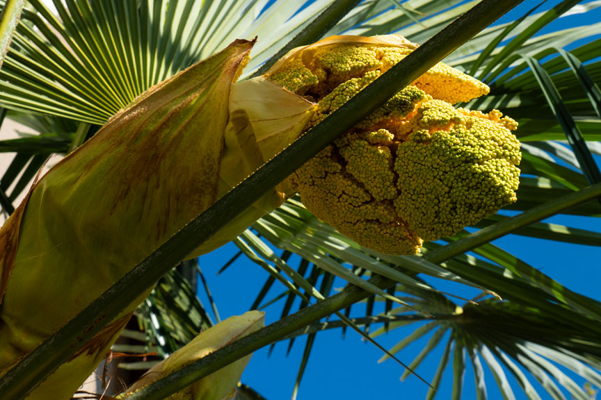 Die Palme, die ich vor etlichen Jahren halbverdurstet aus dem Discounter mit ca. 30 cm Höhe freigekauft hatte, ist inzwischen locker 3,5 Meter groß und fängt an zu blühen.