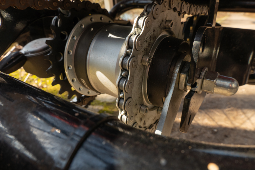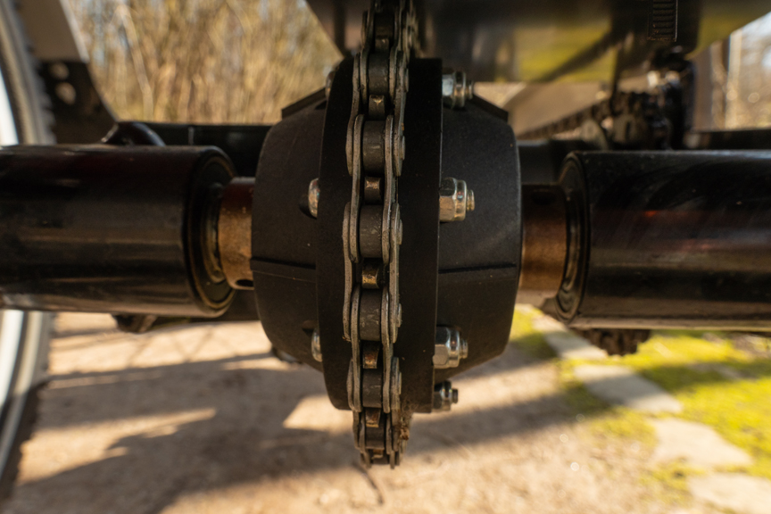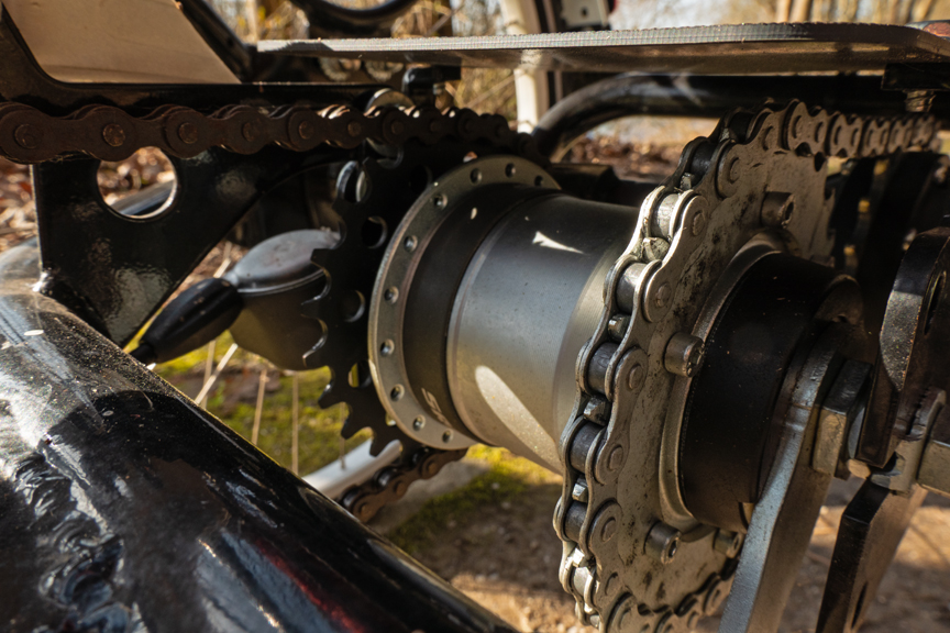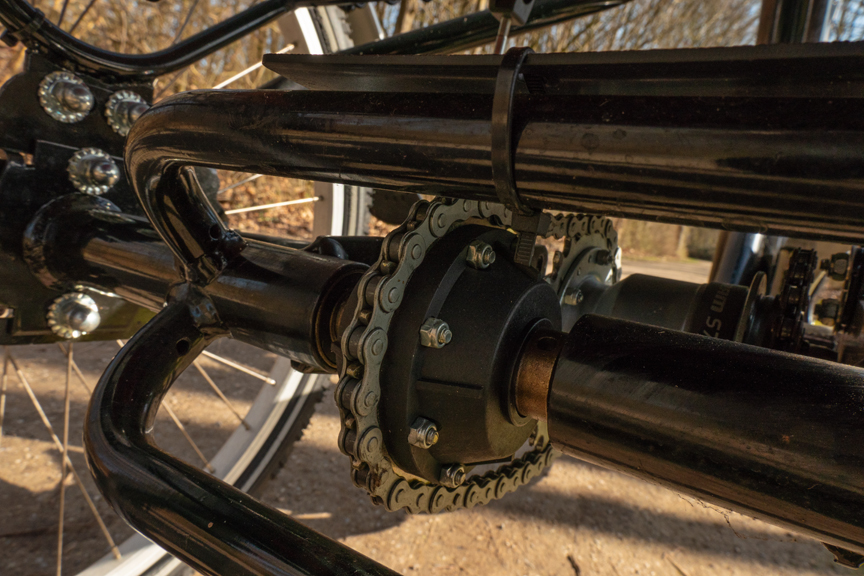 Das Fahrrad hatte auch noch meine geliebte 7 Gang-Nabenschaltung von Sram mit Rücktrittbremse und auf der Hinterachse war das wichtige Differenzial, womit beide Hinterräder angetrieben werden. Der vordere Teil konnte außerdem noch eingeklappt werden.