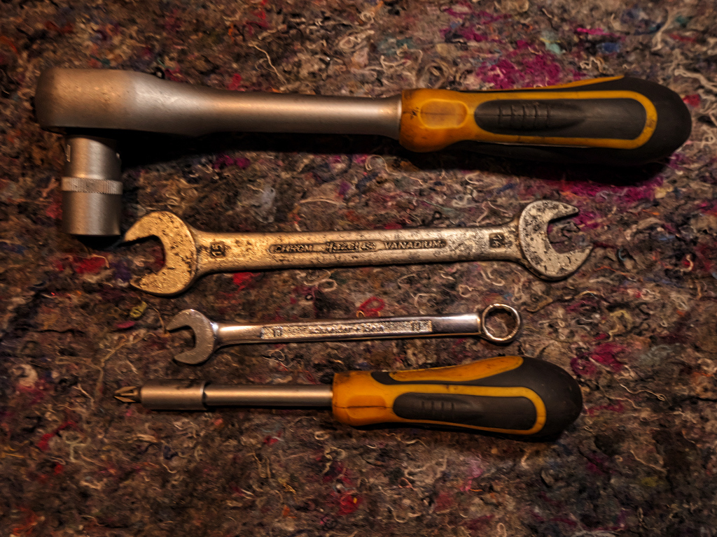 Werkzeug: 15er Nuss mit Knarre, 15er Maulschlüssel, Schraubendreher, 10er Maulschlüssel, 5er Inbusschlüssel und eine Kabelzange